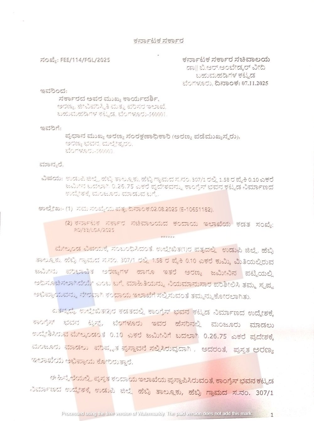 ಉಡುಪಿ ಜಿಲ್ಲೆಯ ಹೆಬ್ರಿ ತಾಲೂಕಿನ ಹೆಬ್ರಿ ಗ್ರಾಮದಲ್ಲಿ ಕಾಂಗ್ರೆಸ್‌ ಭವನ ನಿರ್ಮಾಣ ಮಾಡಲು ಕಾಂಗ್ರೆಸ್‌ ಭವನ ಟ್ರಸ್ಟ್‌ ಕೋರಿರುವ ಜಮೀನು, ಪರಿಭಾವಿತ ಅರಣ್ಯಗಳು ಹಾಗೂ ಇತರೆ ಅರಣ್ಯಗಳ ಜಮೀನಿನ ಪಟ್ಟಿಯಲ್ಲಿ ಅಧಿಸೂಚಿಸಲಾಗಿದೆಯೇ ಎಂಬ ಕುರಿತು ಅರಣ್ಯ ಇಲಾಖೆಯ ಸರ್ಕಾರದ ಹೆಚ್ಚುವರಿ ಮುಖ್ಯ ಕಾರ್ಯದರ್ಶಿ, ಪ್ರಧಾನ ಮುಖ್ಯ ಅರಣ್ಯ ಸಂರಕ್ಷಣಾಧಿಕಾರಿಗೆ ಪತ್ರ ಬರೆದಿದ್ದಾರೆ. 2025ರ ನವೆಂಬರ್‍‌ 7ರಂದು ಬರೆದಿರುವ ಪತ್ರದ ಪ್ರತಿಯು ‘ದಿ ಫೈಲ್‌’ಗೆ ಲಭ್ಯವಾಗಿದೆ.