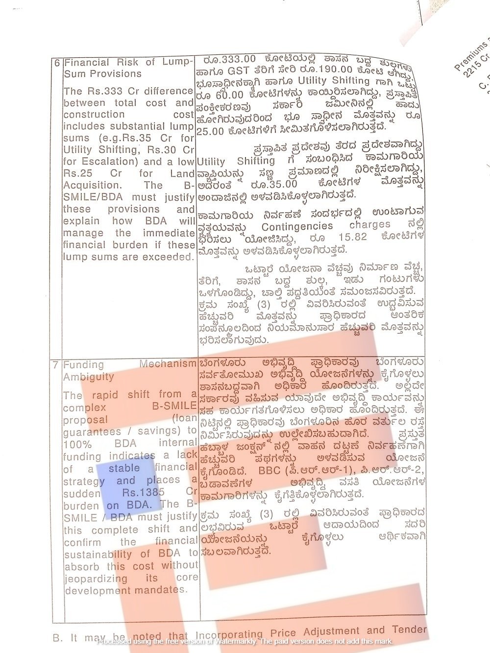ಆದರೆ ಇದೇ ಬಿಡಿಯು ಬೆಂಗಳೂರು ಫೆರಿಫೆರಲ್ ರಿಂಗ್ ರಸ್ತೆ ಭಾಗ 1 ಯೋಜನೆಗೆ ಭೂ ಸ್ವಾಧೀನ, ನಿರ್ಮಾಣ ಹಾಗೂ ನಿರ್ವಹಣೆ ವೆಚ್ಚಕ್ಕೆ ಸಂಬಂಧಿಸಿದಂತೆ ಸಂಪನ್ಮೂಲ ಕ್ರೋಢೀಕರಿಸಿ ಯೋಜನೆ ಕೈಗೆತ್ತಿಕೊಳ್ಳಲು ಆರ್ಥಿಕ ಇಲಾಖೆಗೆ ಸ್ಪಷ್ಟ ವಿವರಗಳನ್ನೇ ನೀಡಿರಲಿಲ್ಲ.