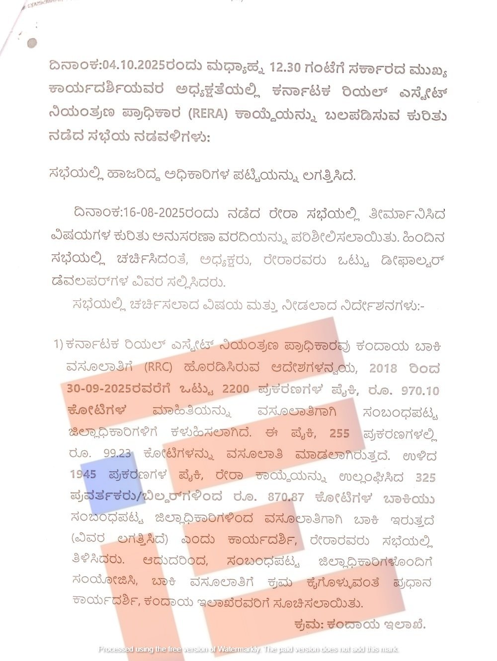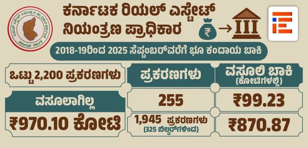 ಕರ್ನಾಟಕ ರಿಯಲ್‌ ಎಸ್ಟೇಟ್‌ ನಿಯಂತ್ರಣ ಪ್ರಾಧಿಕಾರವು ಕಂದಾಯ ಬಾಕಿ ವಸೂಲಾತಿಗೆ ಆದೇಶಗಳನ್ನು ಹೊರಡಿಸಿತ್ತು. 2018ರಿಂದ 2025ರ ಸೆ.30ರವರೆಗೆ ಒಟ್ಟು 2,200 ಪ್ರಕರಣಗಳ ಪೈಕಿ 970.10 ಕೋಟಿ ರು ವಸೂಲಾತಿಗೆ ಬಾಕಿ ಇದೆ ಎಂಬ ಮಾಹಿತಿ ಒದಗಿಸಿತ್ತು. ಈ 970.10 ಕೋಟಿ ರು.ಗಳನ್ನು ವಸೂಲು ಮಾಡಲು ರೇರಾವು, ರಾಜ್ಯದ ಎಲ್ಲಾ ಜಿಲ್ಲಾಧಿಕಾರಿಗಳಿಗೂ ಸೂಚಿಸಿತ್ತು.
