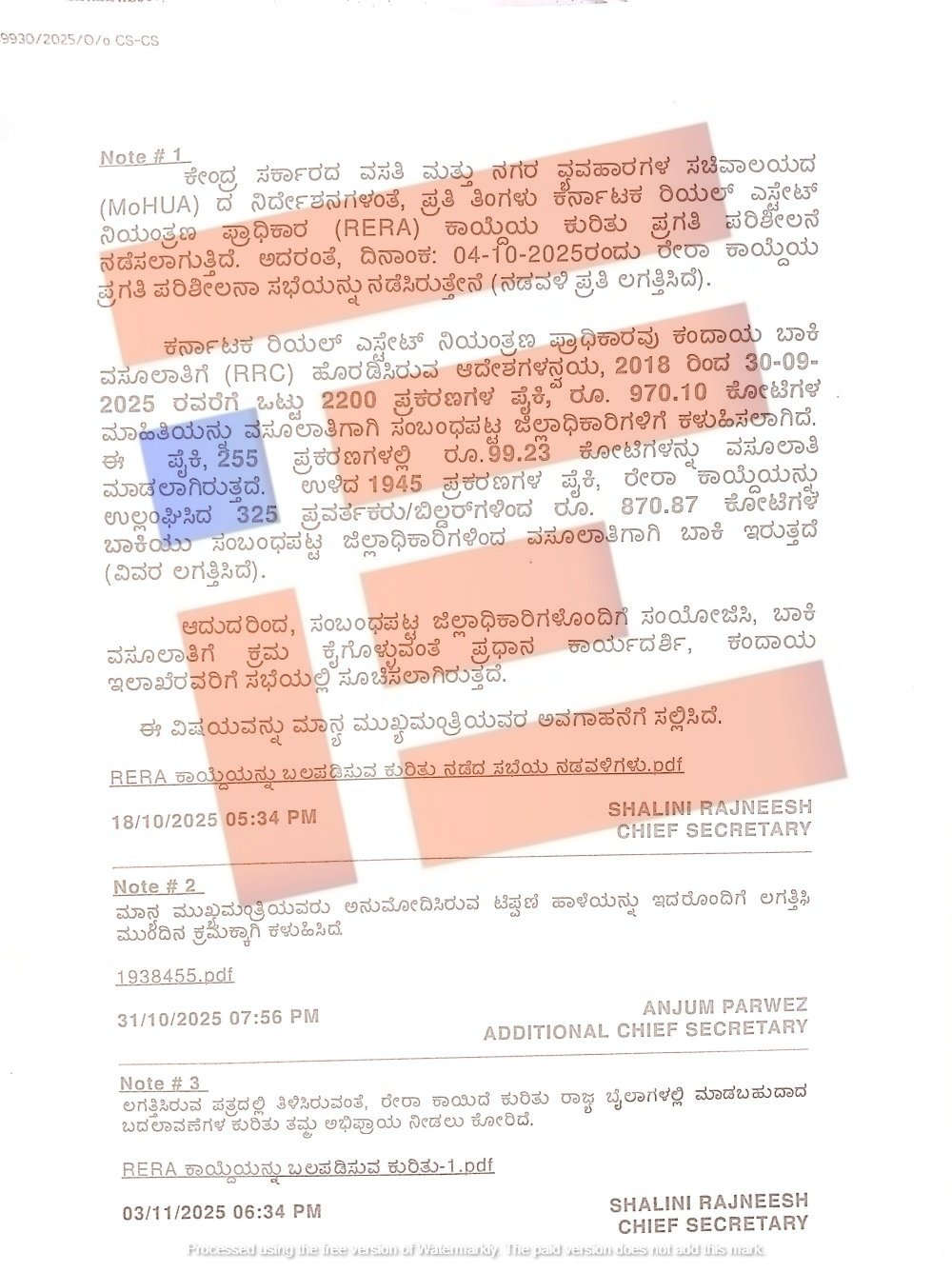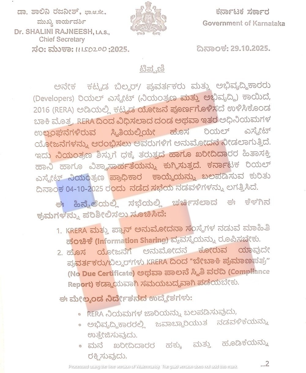 ‘ಅನೇಕ ಕಟ್ಟಡ ಬಿಲ್ಡರ್‍‌, ಪ್ರವರ್ತಕರು, ಅಭಿವೃದ್ಧಿಕಾರರು ರಿಯಲ್‌ ಎಸ್ಟೇಟ್‌ ಕಾಯ್ದೆ 2016ರರ ಅಡಿಯಲ್ಲಿ ಕಟ್ಟಡ ಯೋಜನೆ ಪೂರ್ಣಗೊಳಿಸದೇ ಉಳಿಸಿಕೊಂಡ ಬಾಕಿ ಮೊತ್ತ, ರೇರಾದಿಂದ ವಿಧಿಸಲಾದ ದಂಡ, ಅಥವಾ ಇನ್ನಿತರೆ ಅಧಿನಿಯಮಗಳ ಉಲ್ಲಂಘನೆಗಳಿರುವ ಸ್ಥಿತಿಯಲ್ಲಿಯೇ ಹೊಸ ರಿಯಲ್ ಎಸ್ಟೇಟ್‌ ಯೋಜನೆಗಳನ್ನು ಆರಂಭಿಸಲು ಅವರುಗಳಿಗೆ ಅನುಮೋದನೆ ನೀಡಲಾಗುತ್ತಿದೆ,’ ಎಂದು ರಾಜ್ಯ ಸರ್ಕಾರದ ಮುಖ್ಯ ಕಾರ್ಯದರ್ಶಿ ಶಾಲಿನಿ ರಜನೀಶ್‌ ಅವರು 2025ರ ಅಕ್ಟೋಬರ್‍‌ 29ರಂದು ಬರೆದಿದ್ದ ಟಿಪ್ಪಣಿಯಲ್ಲಿ ವಿವರಿಸಿದ್ದರು.