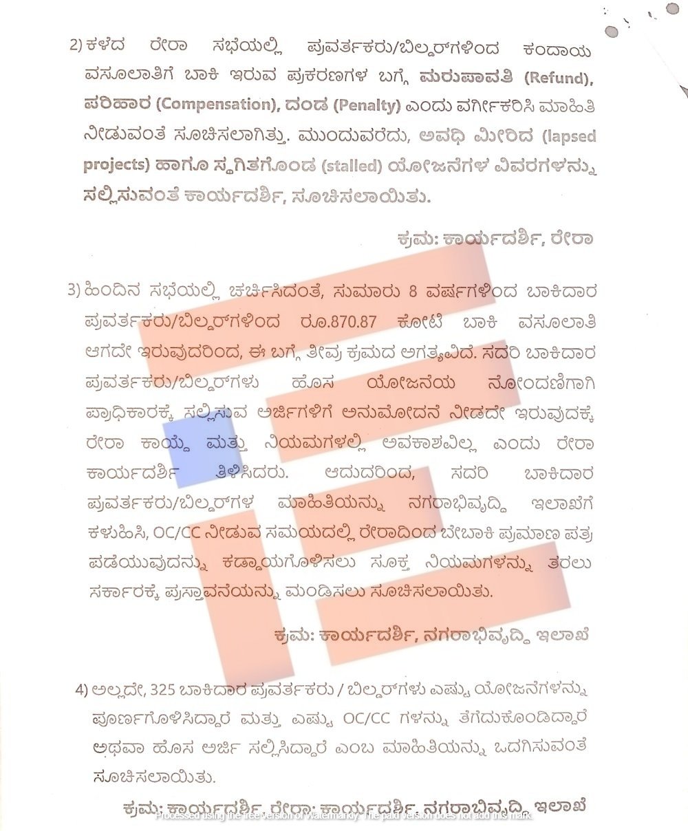 ರೇರಾ ಸಭೆಯಲ್ಲಿ ಪ್ರವರ್ತಕರು, ಬಿಲ್ಡ್‌ರಗಳಿಂದ ಕಂದಾಯ ವಸೂಲಾತಿಗೆ ಬಾಕಿ ಇರುವ ಪ್ರಕರಣಗಳ ಬಗ್ಗೆ ಮರು ಪಾವತಿ ಪರಿಹಾರ ಎಂದು ವರ್ಗೀಕರಿಸಿ ಮಾಹಿತಿ ನೀಡುವಂತೆ ಸೂಚಿಸಿತ್ತು. ಅಲ್ಲದೇ ಅವಧಿ ಮೀರಿದ ಹಾಗೂ ಸ್ಥಗಿತಗೊಂಡ ಯೋಜನೆಗಳ ವಿವರಗಳನ್ನು ಸಲ್ಲಿಸಬೇಕು ಎಂದು ಸಭೆಯು ಸೂಚಿಸಿರುವುದು ನಡವಳಿಯಿಂದ ತಿಳಿದು ಬಂದಿದೆ.