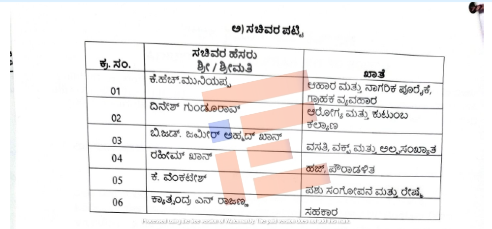 ಕೆ ಹೆಚ್ ಮುನಿಯಪ್ಪ, ದಿನೇಶ್ ಗುಂಡೂರಾವ್, ಬಿ ಝಡ್ ಜಮೀರ್ ಅಹಮದ್ ಖಾನ್, ರಹೀಂ ಖಾನ್, ಕೆ ವೆಂಕಟೇಶ್, ಕೆ ಎನ್ ರಾಜಣ್ಣ