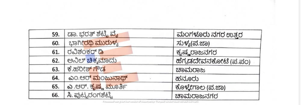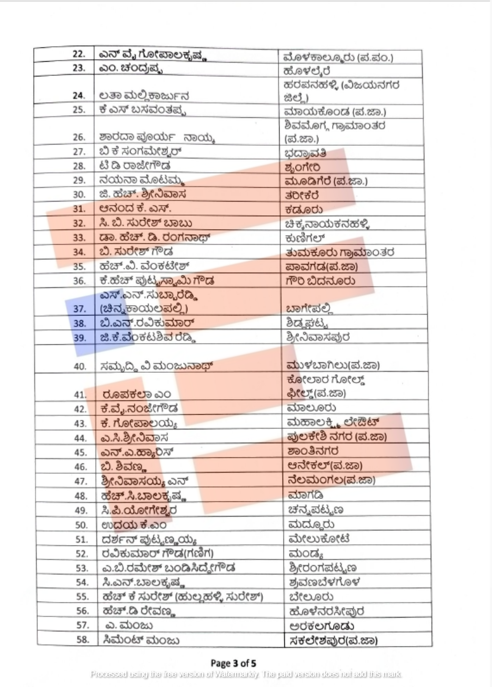 ಶಾರದಾ ಪೂರ್ಯನಾಯಕ್, ಬಿ ಕೆ ಸಂಗಮೇಶ್ವರ್, ಟಿ ಡಿ ರಾಜೇಗೌಡ, ನಯನಾ ಮೋಟಮ್ಮ, ಜಿ ಹೆಚ್ ಶ್ರೀನಿವಾಸ್, ಆನಂಧ್ ಕೆ ಎಸ್, ಸಿ ಬಿ ಸುರೇಶ್ ಬಾಭು, ಡಾ ಹೆಚ್ ಡಿ ರಂಗನಾಥ್, ಬಿ ಸುರೇಶ್ ಗೌಡ, ಹೆಚ್ ವಿ ವೆಂಕಟೇಶ್, ಕೆ ಹೆಚ್ ಪುಟ್ಟಸ್ವಾಮಿಗೌಡ, ಎಸ್ ಎನ್ ಸುಬ್ಬಾರೆಡ್ಡಿ, ಬಿ ಎನ್ ರವಿಕುಮಾರ್, ಜಿ ಕೆ ವೆಂಕಟಶಿವರೆಡ್ಡಿ, ಸಮೃದ್ಧಿ ವಿ ಮಂಜುನಾಥ್, ರೂಪಕಲಾ ಎಂ, ಕೆ ವೈ ನಂಜೇಗೌಡ, ಕೆ ಗೋಪಾಲಯ್ಯ, ಎ ಸಿ ಶ್ರೀನಿವಾಸ, ಎನ್ ಎ ಹ್ಯಾರೀಸ್, ಬಿ ಶಿವಣ್ಣ, ಶ್ರೀನಿವಾಸಯ್ಯ ಎನ್, ಹೆಚ್ ಸಿ ಬಾಲಕೃಷ್ಣ,