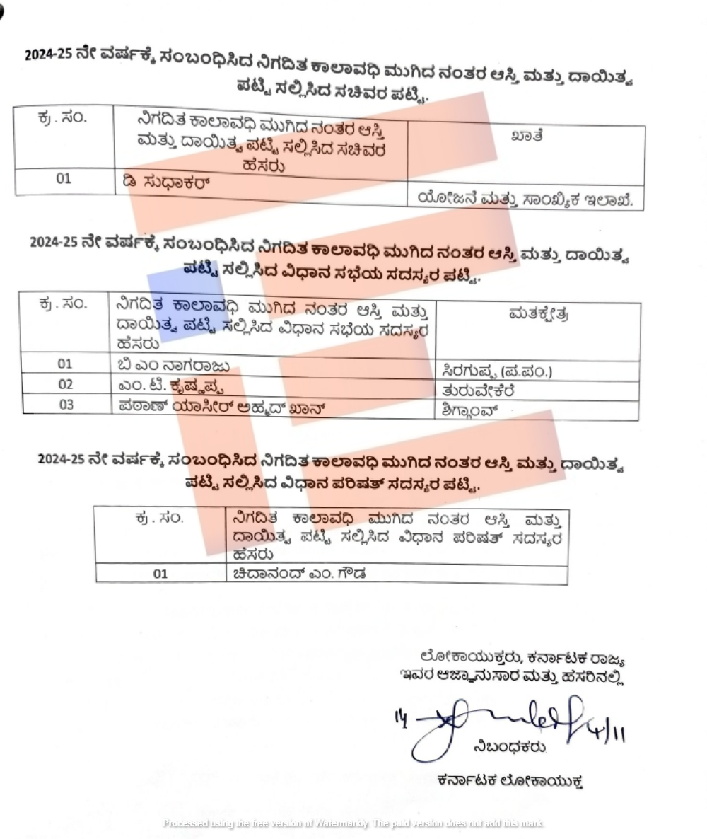 ಆಸ್ತಿ ವಿವರ ಪಟ್ಟಿ ಸಲ್ಲಿಸದೇ ಇರುವ ಸಚಿವರು ಮತ್ತು ಶಾಸಕರ ಪಟ್ಟಿಯನ್ನು ಕರ್ನಾಟಕ ಲೋಕಾಯುಕ್ತ ಸಂಸ್ಥೆಯು 2025ರ ನವೆಂಬರ್ 4ರಂದು ಬಿಡುಗಡೆಗೊಳಿಸಿದೆ. ಈ ಪಟ್ಟಿಯು ದಿ ಫೈಲ್ ಗೆ ಲಭ್ಯವಾಗಿದೆ.