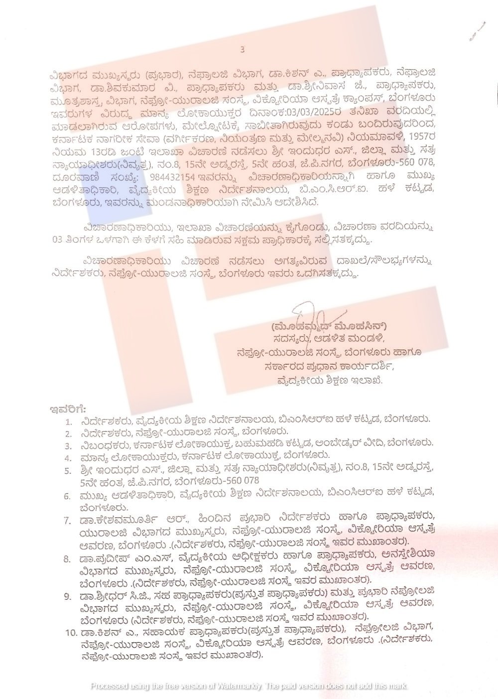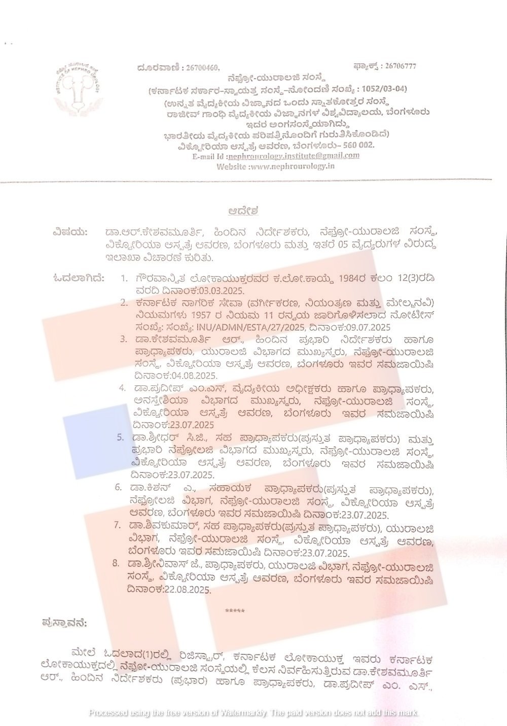 ನೆಪ್ರೋ ಯುರಾಲಜಿ ಸಂಸ್ಥೆಯ ಆಡಳಿತ ಮಂಡಳಿಯ ಸದಸ್ಯ ಹಾಗೂ ವೈದ್ಯಕೀಯ ಶಿಕ್ಷಣ ಇಲಾಖೆಯ ಸರ್ಕಾರದ ಪ್ರಧಾನ ಕಾರ್ಯದರ್ಶಿ ಮೊಹಮ್ಮದ್ ಮೊಹಸಿನ್ ಅವರು 2025ರ ಅಕ್ಟೋಬರ್ 28ರಂದೇ ಆದೇಶ ಹೊರಡಿಸಿದ್ದಾರೆ. ಈ ಆದೇಶಕ್ಕೆ ಸಚಿವ ಡಾ ಶರಣ ಪ್ರಕಾಶ್ ಪಾಟೀಲ್ ಅವರು ಅನುಮೋದಿಸಿದ್ದಾರೆ ಎಂದು ಗೊತ್ತಾಗಿದೆ.