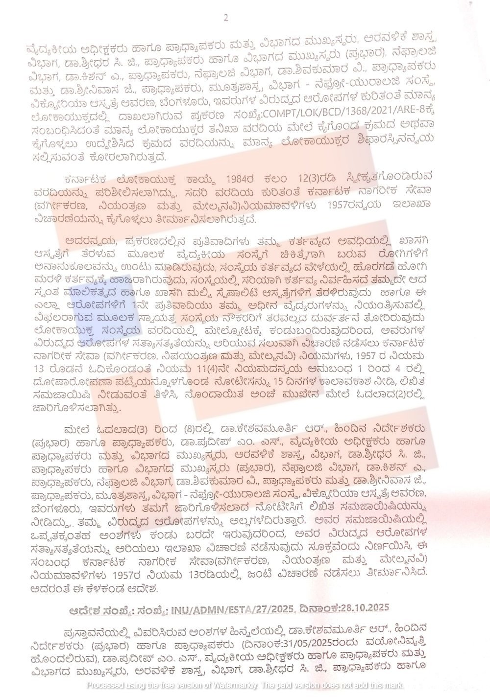 ಅಲ್ಲದೇ ಈ ಆರೋಪಿತ ವೈದ್ಯರುಗಳು ತಮ್ಮದೇ ಆದ ಸ್ವಂತ ಮಾಲೀಕತ್ವದ ಹಾಗೂ ಖಾಸಗಿ ಮಲ್ಟಿ ಸ್ಪೆಷಾಲಿಟಿ ಆಸ್ಪತ್ರೆಗಳಿಗೆ ತೆರಳಿದ್ದರು. ಈ ಪ್ರಕರಣದ 1ನೇ ಪ್ರತಿವಾದಿಯು ತಮ್ಮ ಅಧೀನ ವೈದ್ಯರನ್ನು ನಿಯಂತ್ರಿಸುವಲ್ಲಿ ವಿಫಲವಾಗಿದ್ದರು. ಅಲ್ಲದೇ ಈ ವೈದ್ಯರುಗಳು ಸ್ವಾಯತ್ತ ಸಂಸ್ಥೆಯ ನೌಕರರಿಗೆ ತರವಲ್ಲದ ರೀತಿಯ ದುರ್ನಡತೆ ತೋರಿದ್ದರು ಎಂದು ಲೋಕಾಯುಕ್ತ ತನಿಖಾ ವರದಿಯಲ್ಲಿ ಮೇಲ್ನೋಟಕ್ಕೆ ಕಂಡು ಬಂದಿದೆ ಎಂದು ಆದೇಶದಲ್ಲಿ ವಿವರಿಸಿರುವುದು ಗೊತ್ತಾಗಿದೆ.