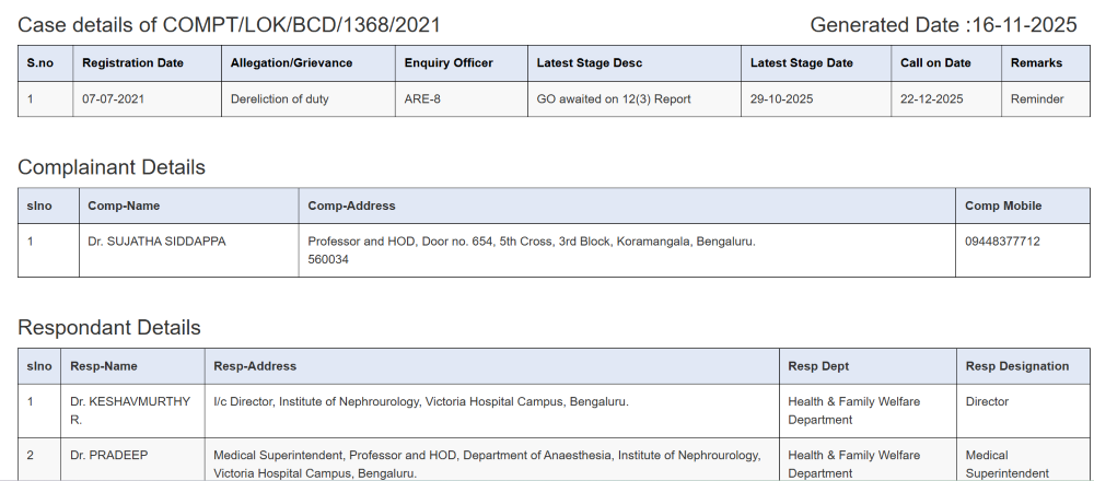 ಡಾ ಆರ್ ಕೇಶವಮೂರ್ತಿ, ಡಾ ಪ್ರದೀಪ್ ಎಂ ಎಸ್, ಡಾ ಶ್ರೀಧರ ಸಿ ಜೆ, ಡಾ ಕಿಶನ್ ಎ, ಡಾ ಶ್ರೀನಿವಾಸ ಅವರ ವಿರುದ್ಧ ಡಾ ಸುಜಾತ ಸಿದ್ದಪ್ಪ ಎಂಬುವರು ಲೋಕಾಯುಕ್ತಕ್ಕೆ 2021ರಲ್ಲಿ ದೂರು ಸಲ್ಲಿಸಿದ್ದರು.