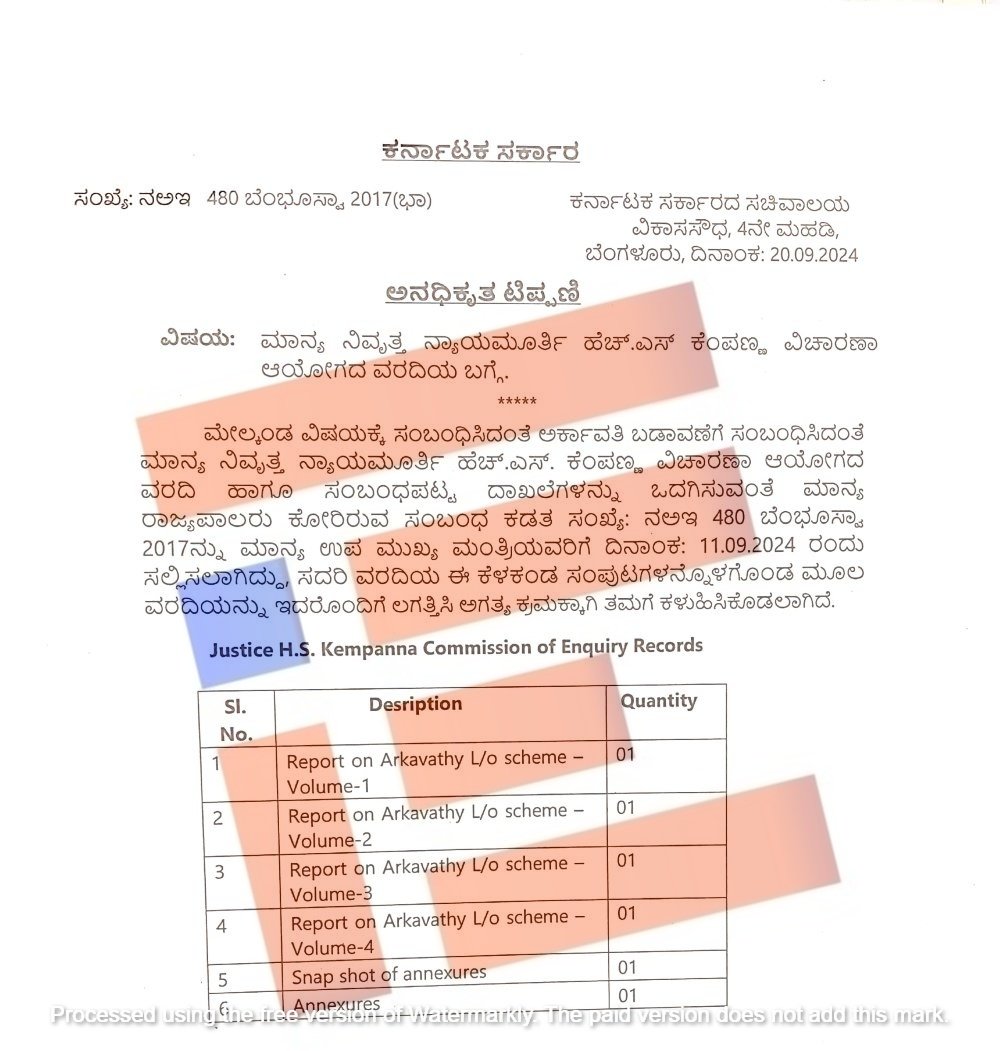 ‘ಅರ್ಕಾವತಿ ಬಡಾವಣೆಗೆ ಸಂಬಂಧಿಸಿದಂತೆ ನಿವೃತ್ತ ನ್ಯಾಯಮೂರ್ತಿ ಹೆಚ್ ಎಸ್ ಕೆಂಪಣ್ಣ ವಿಚಾರಣೆ ಆಯೋಗದ ವರದಿ ಹಾಗೂ ಸಂಬಂಧಪಟ್ಟ ಕಡತ (ಸಂಖ್ಯೆ ನಅಇ 480 ಬೆಂಭೂಸ್ವಾ 2017) ವನ್ನು ಉಪ ಮುಖ್ಯಮಂತ್ರಿ ಅವರಿಗೆ 2024ರ ಸೆ.11ರಂದು ಸಲ್ಲಿಸಲಾಗಿದೆ. ಈ ವರದಿಯ ಸಂಪುಟಗಳನ್ನೊಳಗೊಂಡ ಮೂಲ ವರದಿಯನ್ನೂ ಸಹ ಕಳಿಸಲಾಗಿದೆ,’ ಎಂದು ನಗರಾಭಿವೃದ್ಧಿ ಇಲಾಖೆಯ ಸರ್ಕಾರದ ಅಧೀನ ಕಾರ್ಯದರ್ಶಿ ರಾಜೇಶ್ ಎಸ್ ಸೂಳಿಕೇರಿ ಅವರು 2024ರ ಸೆ. 20ರಂದು ಅನಧಿಕೃತ ಟಿಪ್ಪಣಿಯಲ್ಲಿ ವಿವರಿಸಿದ್ದರು.