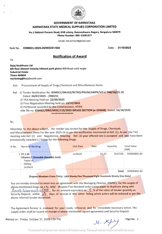 ಆದರೀಗ ಇದೇ ಬಜಾಜ್ ಹೆಲ್ತ್ ಕೇರ್ ಕಂಪನಿಗೆ ಕರ್ನಾಟಕ ವೈದ್ಯಕೀಯ ಸರಬರಾಜು ನಿಗಮವು 61.55 ರು ದರದಲ್ಲಿ ನೋಟಿಫಿಕೇಷನ್ ಅವಾರ್ಡ್ ಮಾಡಿದೆ. ಕಳೆದ ವರ್ಷದಲ್ಲಿ ನಮೂದಿಸಿದ್ದ ದರಕ್ಕೆ ಹೋಲಿಸಿದರೆ 8 ರುಪಾಯಿ ಕಡಿಮೆ ಮಾಡಿದೆ. ಅಲ್ಲದೇ 100 ಮಾತ್ರೆಗಳ ಒಂದು ಪೊಟ್ಟಣದಂತೆ ಒಟ್ಟಾರೆ 31, 37,220 ಪೊಟ್ಟಣಗಳನ್ನು ಖರೀದಿಸಲು 2025ರ ಅಕ್ಟೋಬರ್ 31ರಂದು ನೋಟಿಫಿಕೇಷನ್ ಅವಾರ್ಡ್ ಮಾಡಿರುವುದು ತಿಳಿದು ಬಂದಿದೆ.