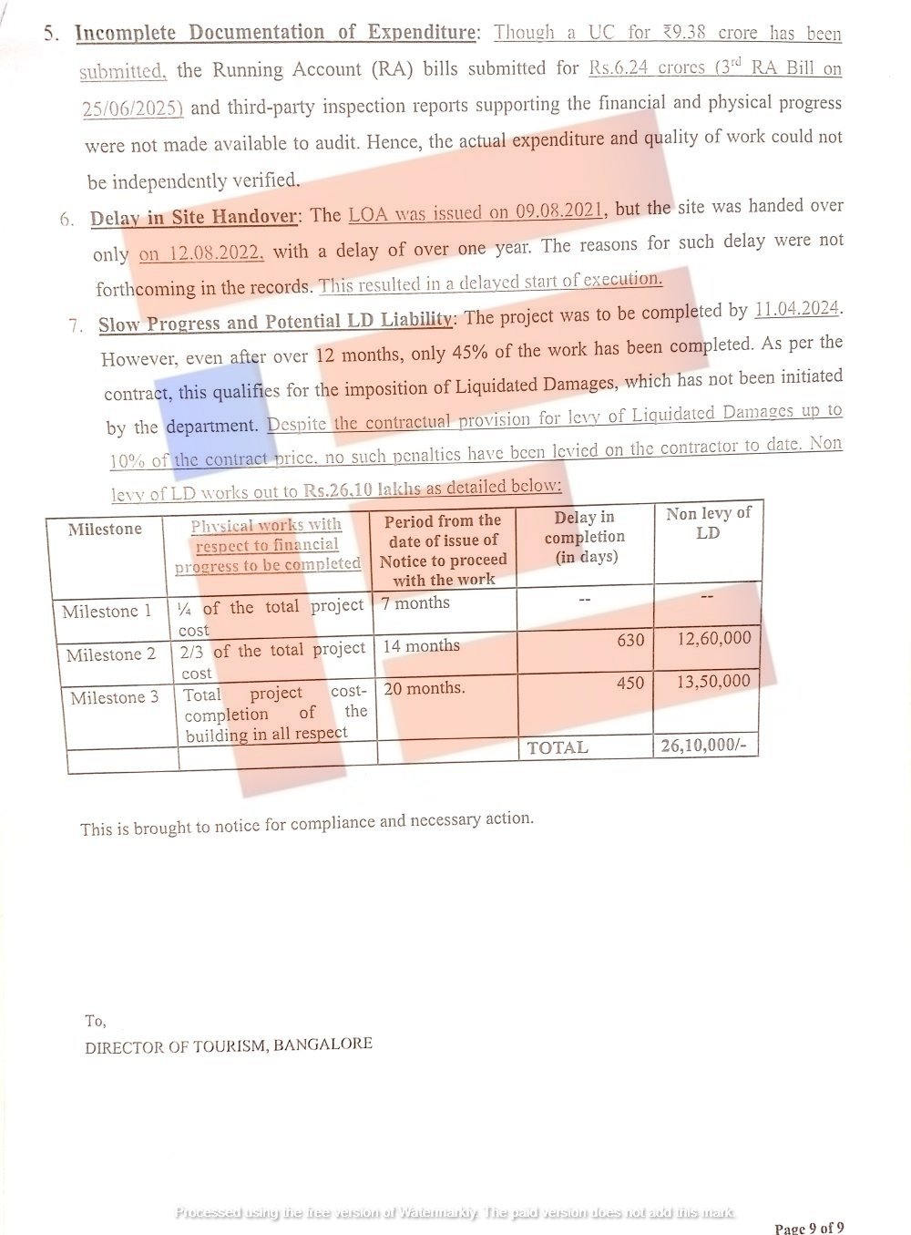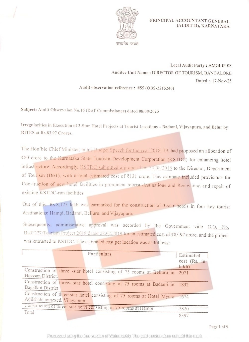 ಈ ಮೂರೂ ಸ್ಥಳಗಳಲ್ಲಿ ತ್ರಿ ಸ್ಟಾರ್‍‌ ಹೋಟೆಲ್‌ಗಳನ್ನು ನಿರ್ಮಾಣಕ್ಕೆ 83.97 ಕೋಟಿ ರು. ವೆಚ್ಚಕ್ಕೆ ಪ್ರಧಾನ ಮಹಾಲೇಖಪಾಲರು ಮತ್ತು ಮಹಾಲೆಕ್ಕಪರಿಶೋಧಕರು ಆಕ್ಷೇಪ ಎತ್ತಿದ್ದಾರೆ. ಈ ಸಂಬಂಧ ಸ್ಪಷ್ಟೀಕರಣ ನೀಡಬೇಕು ಎಂದು ಪ್ರವಾಸೋದ್ಯಮ ಅಭಿವೃದ್ದಿ ನಿಗಮದ ನಿರ್ದೇಶಕರಿಗೆ 2025ರ ನವೆಂಬರ್‍‌ 17ರಂದು ಪತ್ರ ಬರೆದಿದ್ದಾರೆ.