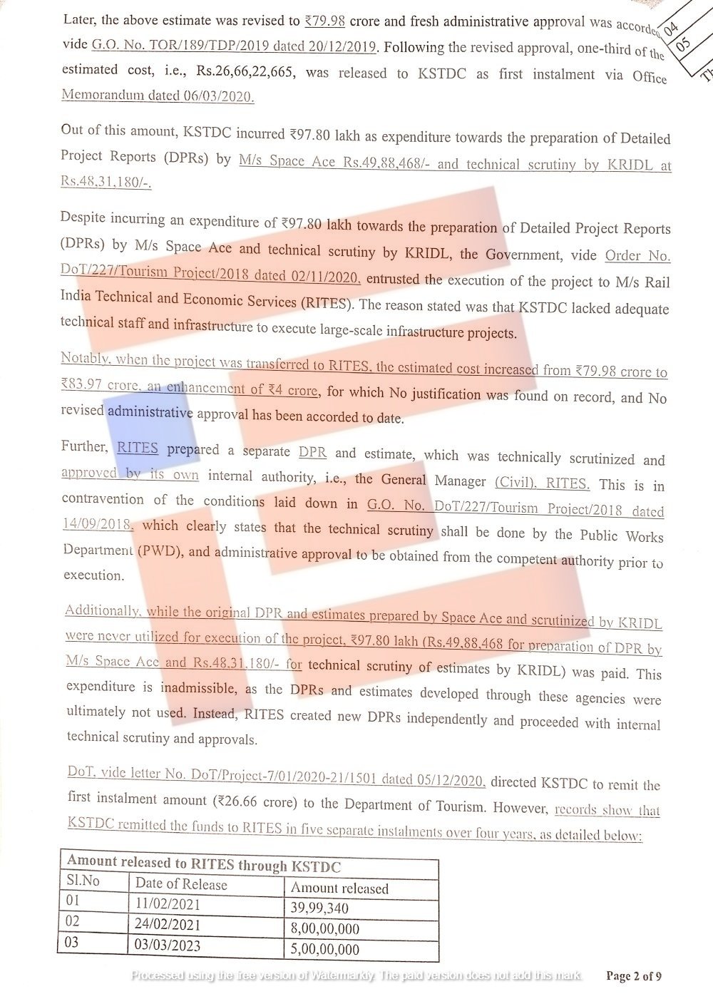 ಆದರೆ ಪ್ರವಾಸೋದ್ಯಮ ಅಭಿವೃದ್ಧಿ ನಿಗಮವು, ಇದನ್ನು ರೈಟ್ಸ್‌ ಸಂಸ್ಥೆಯ ಮೂಲಕ ಕಾರ್ಯಗತಗೊಳಿಸಿರುವುದು ಮತ್ತು ತಾಂತ್ರಿಕ ಪರಿಶೀಲನೆ ಮಾಡಿಸಿರುವುದು 2018ರ ಆದೇಶದಲ್ಲಿನ ಷರತ್ತುನ್ನು ಉಲ್ಲಂಘಿಸಿದೆ ಎಂದು ಸಿಎಜಿ ಪತ್ರದಲ್ಲಿ ವಿವರಿಸಿರುವುದು ತಿಳಿದು ಬಂದಿದೆ.