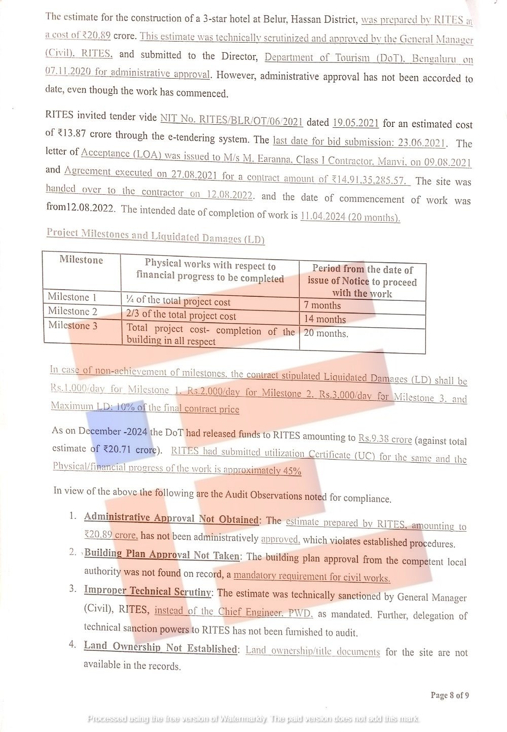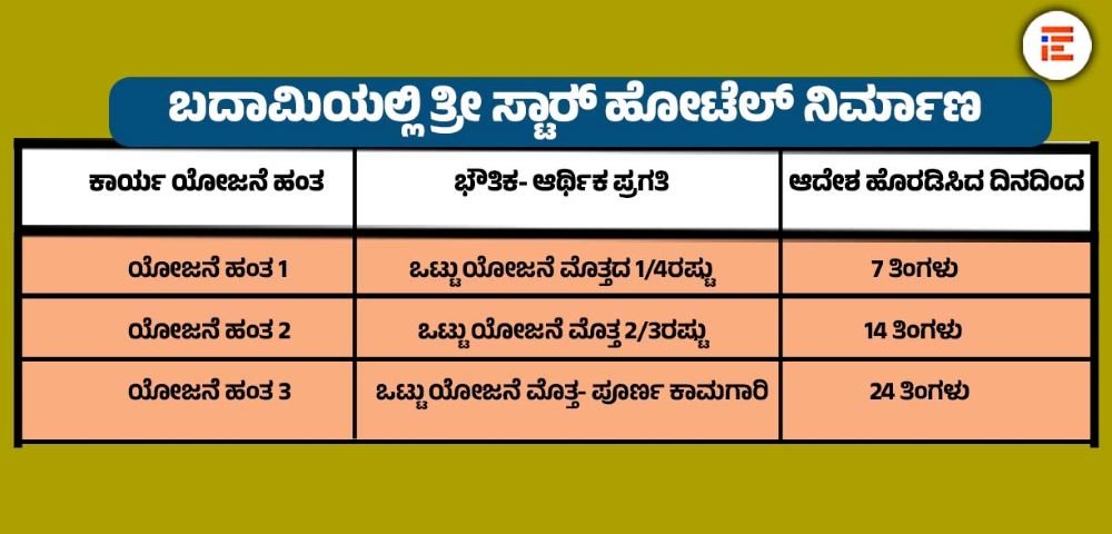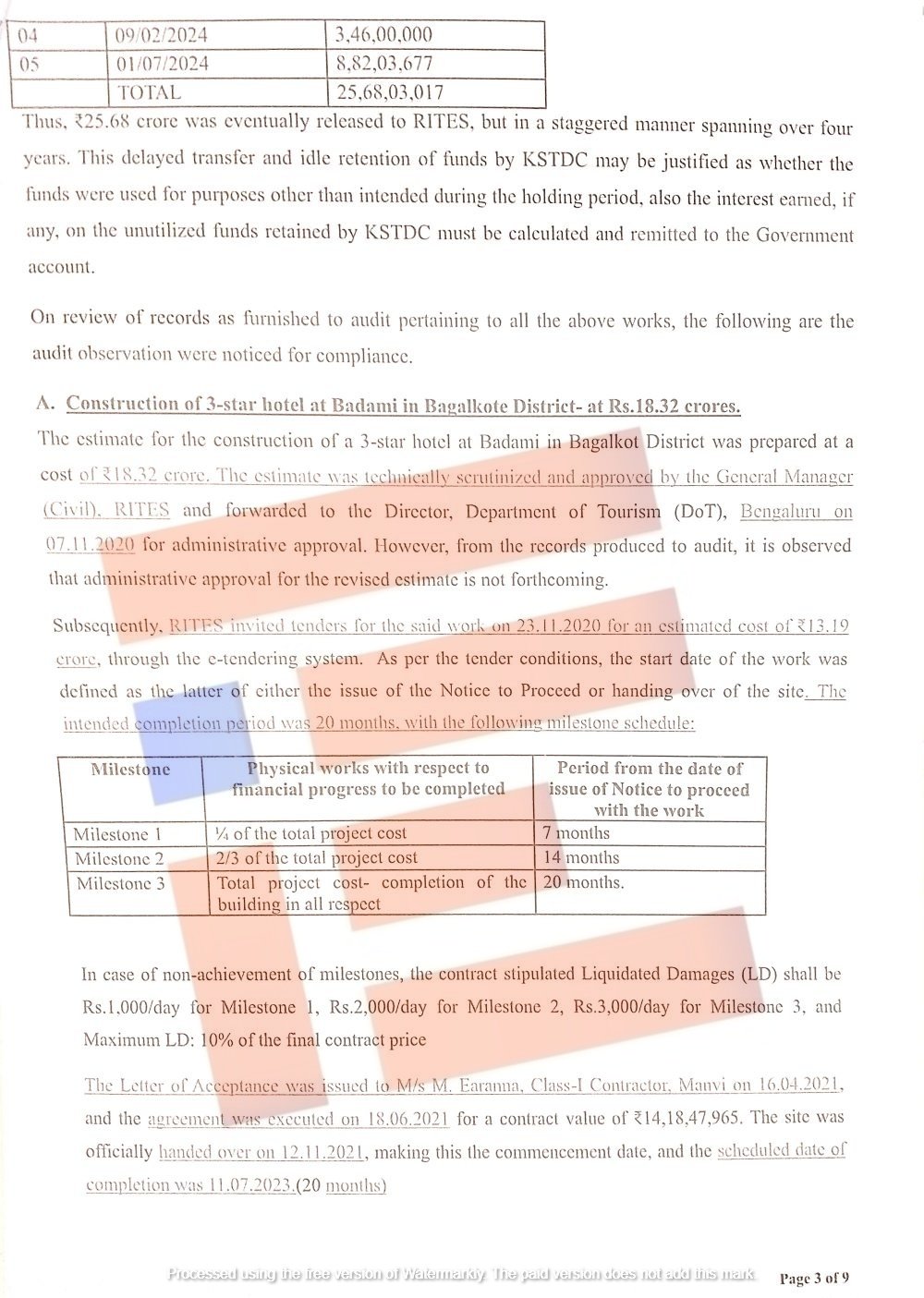 ಬದಾಮಿಯಲ್ಲಿ ತ್ರಿ ಸ್ಟಾರ್ ಹೋಟೆಲ್‌ ನಿರ್ಮಾಣಕ್ಕೆ ಆರಂಭದಲ್ಲಿ 12 ಕೋಟಿ ರು ಮೊತ್ತದ ಅಂದಾಜು ವೆಚ್ಚ ಸಿದ್ದಪಡಿಸಿತ್ತು. ಇದನ್ನು ರೈಟ್ಸ್‌ ಸಂಸ್ಥೆಯು ತಾಂತ್ರಿಕವಾಗಿ ಪರಿಶೀಲಿಸಿತ್ತು. ಕರ್ನಾಟಕ ಪ್ರವಾಸೋದ್ಯಮ ಅಭಿವೃದ್ಧಿ ನಿಗಮದ ಆಡಳಿತಾತ್ಮಕ ಅನುಮೋದನೆಗಾಗಿ 2020ರ ನವೆಂಬರ್‍‌ 7ರಂದು ಕಳಿಸಿತ್ತು. ಆದರೆ ಈ ಪರಿಷ್ಕೃತ ಅಂದಾಜಿಗೆ ಆಡಳಿತಾತ್ಮಕ ಅನುಮೋದನೆಯೇ ದೊರೆತಿರಲಿಲ್ಲ ಎಂಬುದನ್ನು ಸಿಎಜಿಯು ಗಮನಿಸಿರುವುದು ಪತ್ರದಿಂದ ತಿಳಿದು ಬಂದಿದೆ.