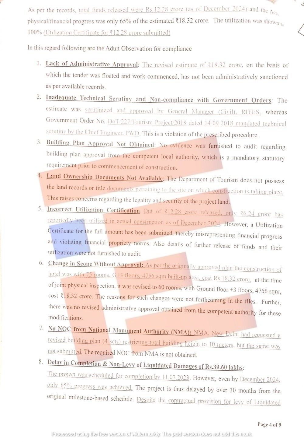 ಈ ಹೋಟೆಲ್‌ ನಿರ್ಮಾಣಕ್ಕೆ ರಾಷ್ಟ್ರೀಯ ಸ್ಮಾರಕ ಪ್ರಾಧಿಕಾರದ ಎನ್‌ಒಸಿಯನ್ನೇ ಪಡೆದಿಲ್ಲ ಎಂದು ಸಿಎಜಿಯು ತನ್ನ ಅವಲೋಕನದಲ್ಲಿ ಹೇಳಿದೆ. ಹಾಗೆಯೇ 2024ರ ಡಿಸೆಂಬರ್‍‌ ಹೊತ್ತಿಗೆ ಶೇ. 98ರಷ್ಟು ಪ್ರಗತಿ ಸಾಧಿಸಿದೆ. ಕಾಮಗಾರಿಯನ್ನು ಪೂರ್ಣಗೊಳಿಸಿಲ್ಲ. ಈ ವಿಳಂಬಕ್ಕೆ ಕಾರಣರಾದ ಗುತ್ತಿಗೆದಾರರಿಗೆ ಯಾವುದೇ ದಂಡವನ್ನೂ ವಿಧಿಸಿಲ್ಲ.