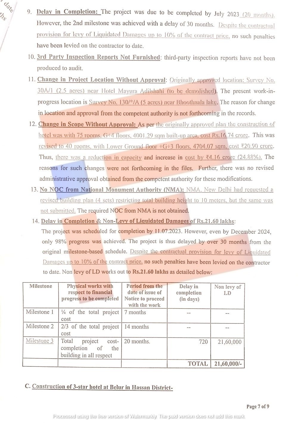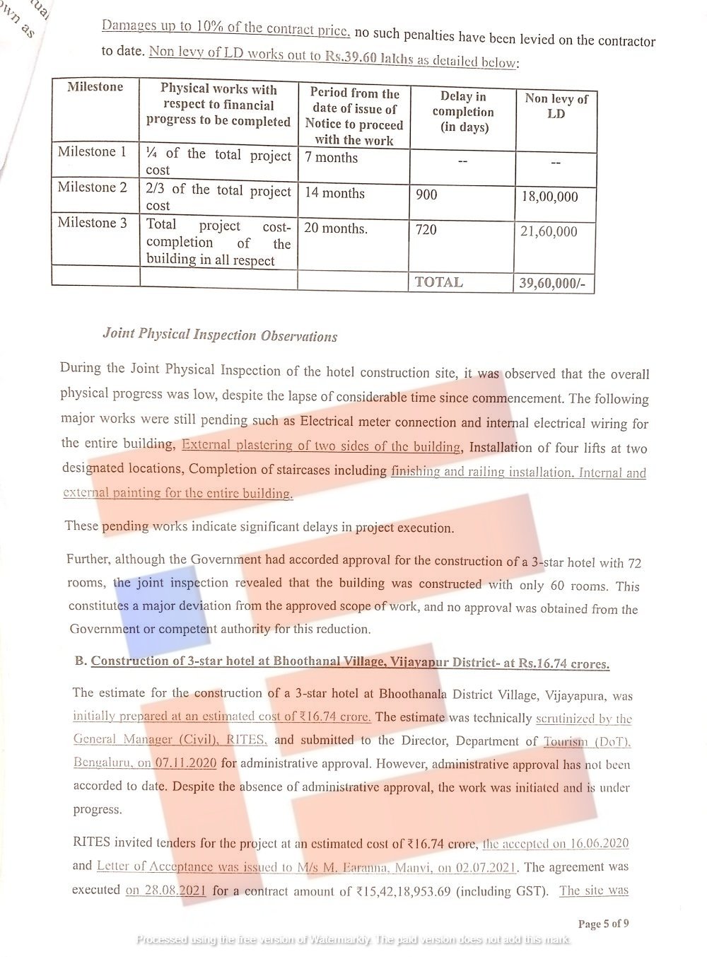 ಹೋಟೆಲ್ ನಿರ್ಮಾಣ ಸ್ಥಳದ ಜಂಟಿ ಭೌತಿಕ ತಪಾಸಣೆಯ ಸಮಯದಲ್ಲಿ, ಕೆಲಸ ಪ್ರಾರಂಭವಾದ ನಂತರ ಗಣನೀಯ ಸಮಯ ಕಳೆದಿರುವುದು ಗೊತ್ತಾಗಿದೆ. ಒಟ್ಟಾರೆ ಭೌತಿಕ ಪ್ರಗತಿಯು ಕಡಿಮೆಯಾಗಿದೆ ಎಂದು ಸಿಎಜಿಯು ಗಮನಿಸಿತ್ತು. ಸಂಪೂರ್ಣ ಕಟ್ಟಡಕ್ಕೆ ವಿದ್ಯುತ್ ಮೀಟರ್ ಸಂಪರ್ಕ ಮತ್ತು ಆಂತರಿಕ ವಿದ್ಯುತ್ ವೈರಿಂಗ್ ಕೆಲಸ ಪೂರ್ಣಗೊಂಡಿರಲಿಲ್ಲ.