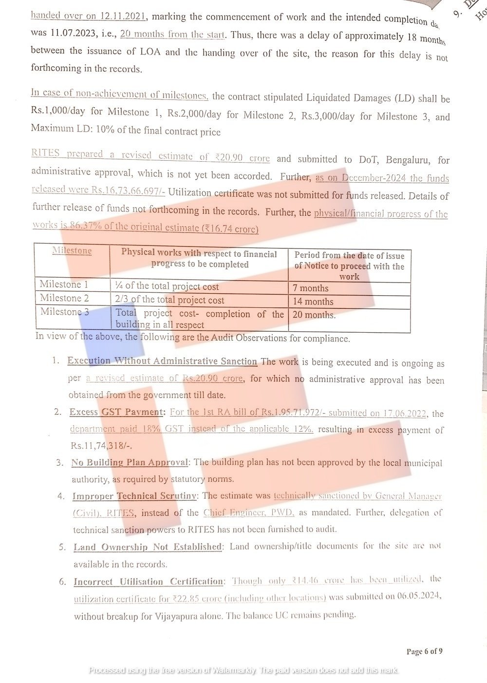 ಶಾಸನಬದ್ಧ ಮಾನದಂಡಗಳ ಪ್ರಕಾರ ಅಗತ್ಯವಿರುವಂತೆ ಕಟ್ಟಡ ಯೋಜನೆಯನ್ನು ಸ್ಥಳೀಯ ಮುನ್ಸಿಪಲ್ ಪ್ರಾಧಿಕಾರದಿಂದ ಅನುಮೋದನೆ ಪಡೆದಿಲ್ಲ. ಹಾಗೆಯೇ ತಾಂತ್ರಿಕ ಪರಿಶೀಲನೆಯೂ ಸಹ ಅನುಚಿತವಾಗಿತ್ತು. ಪಿಡಬ್ಲ್ಯೂಡಿ ಬದಲಾಗಿ ರೈಟ್ಸ್‌ ಸಂಸ್ಥೆಯಿಂದ ನಡೆಸಲಾಗಿತ್ತು. ಈ ಸಂಬಂಧ ಯಾವುದೇ ದಾಖಲೆಗಳನ್ನು ಲೆಕ್ಕ ಪರಿಶೋಧನೆಗೆ ಒದಗಿಸಿಲ್ಲ. ಹಾಗೆಯೇ ಭೂ ಮಾಲೀಕತ್ವಕ್ಕೆ ಸಂಬಂಧಿಸಿದಂತೆ ಯಾವುದೇ ದಾಖಲೆಗಳು ಲಭ್ಯವಿರಲಿಲ್ಲ.
