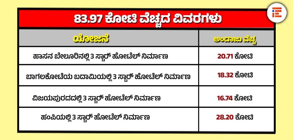 ಈ ಪ್ರಸ್ತಾವನೆಯನ್ನು ಪರಿಶೀಲಿಸಿದ್ದ ಹಿಂದಿನ ಸಮ್ಮಿಶ್ರ ಸರ್ಕಾರವು 83.97 ಕೋಟಿ ರು ವೆಚ್ಚಕ್ಕೆ ಮಾತ್ರ ಆಡಳಿತಾತ್ಮಕ ಅನುಮೋದನೆ ನೀಡಿತ್ತು. ಇದರ ಪ್ರಕಾರ ಹಾಸನ ಜಿಲ್ಲೆಯ ಬೇಲೂರಿನಲ್ಲಿ 75 ಕೊಠಡಿಗಳುಳ್ಳ ತ್ರಿ ಸ್ಟಾರ್‍‌ ಹೋಟೆಲ್‌ಗೆ 20.71ಕೋಟಿ ರು, ಬದಾಮಿಯಲ್ಲಿ 75 ಕೊಠಡಿಗಳುಳ್ಳ ತ್ರಿ ಸ್ಟಾರ್ ಹೋಟೆಲ್‌ಗೆ 18.32 ಕೋಟಿ ರು., ವಿಜಯಪುರದಲ್ಲಿಯೂ 75 ಕೊಠಡಿಗಳುಳ್ಳ ತ್ರಿ ಸ್ಟಾರ್‍‌ ಹೋಟೆಲ್‌ಗೆ 16.74 ಕೋಟಿ, ಹಂಪಿಯಲ್ಲಿಯೂ 75 ಕೊಠಡಿಗಳುಳ್ಳ ತ್ರಿ ಸ್ಟಾರ್ ಹೋಟೆಲ್‌ಗೆ 28.20 ಕೋಟಿ ರು ಅಂದಾಜು ವೆಚ್ಚಕ್ಕೆ ಆಡಳಿತಾತ್ಮಕ ಅನುಮೋದನೆ ನೀಡಿತ್ತು.