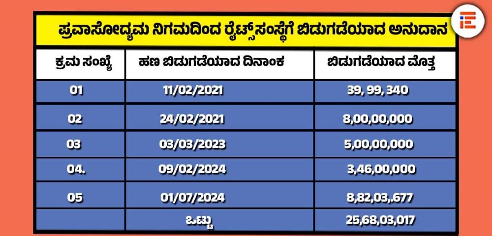 ರೈಟ್ಸ್‌ ಸಂಸ್ಥೆಗೆ ಮೊದಲ ಕಂತಿನ ರೂಪದಲ್ಲಿ 26.66 ಕೋಟಿ ರು.ಗಳನ್ನು ಪಾವತಿಸಲು ಕರ್ನಾಟಕ ಪ್ರವಾಸೋದ್ಯಮ ಅಭಿವೃದ್ಧಿ ನಿಗಮವು 2020ರ ಡಿಸೆಂಬರ್‍‌ 5ರಂದು ನಿರ್ದೇಶಿಸಿತ್ತು. ಆದರೆ ದಾಖಲೆಗಳ ಪ್ರಕಾರ 2021ರ ಫೆ.11ರಂದು 39,99,340 ರು., 2021ರ ಫೆ.24ರಂದು 8,00,00,000 ರು, 2023ರ ಮಾರ್ಚ್‌ 3ರಂದು 5,00,00,000, 2024ರ ಫೆ.9ರಂದು 3,46,00,000 ರು., 2024ರ ಜುಲೈ 1ರಂದು 8,82,03,677 ರು. ಸೇರಿ ಒಟ್ಟಾರೆ 25,68,03, 017 ಕೋಟಿ ರು ಗಳನ್ನು ಐದು ಕಂತುಗಳಲ್ಲಿ ಬಿಡುಗಡೆ ಮಾಡಿತ್ತು.