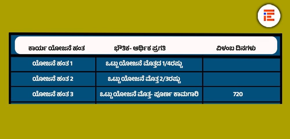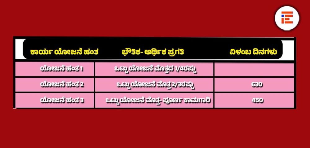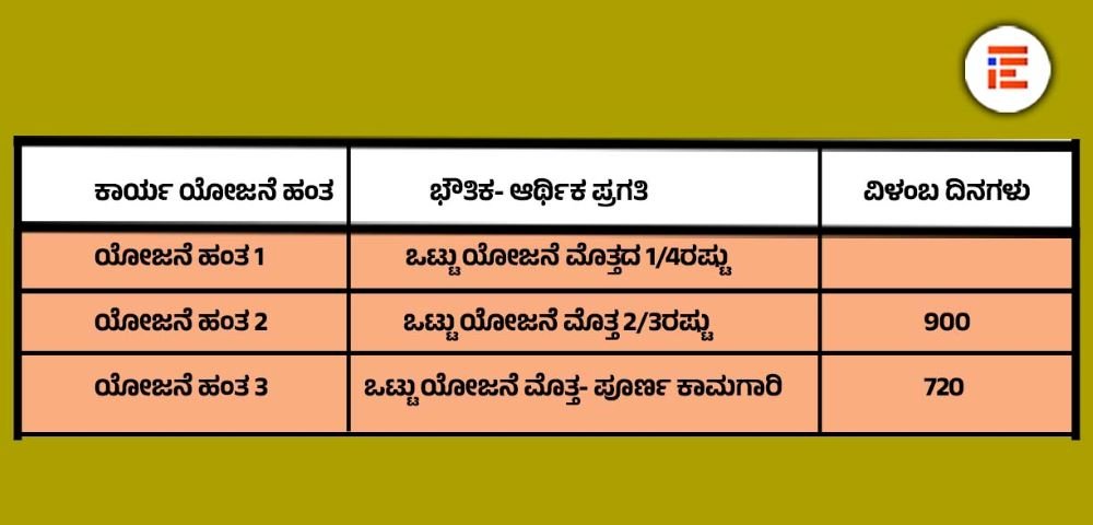 ಈ ಯೋಜನೆಯನ್ನು ಜುಲೈ 2023 ರೊಳಗೆ (20 ತಿಂಗಳುಗಳು) ಪೂರ್ಣಗೊಳಿಸಲು ನಿರ್ಧರಿಸಿತ್ತು. ಆದರೆ 30 ತಿಂಗಳ ವಿಳಂಬದೊಂದಿಗೆ ಪ್ರಗತಿ ಸಾಧಿಸಿತ್ತು. ಸಾಧಿಸಲಾಗಿದೆ. ಆದರೂ ಗುತ್ತಿಗೆದಾರನಿಗೆ ಯಾವುದೇ ದಂಡವನ್ನೂ ವಿಧಿಸಿಲ್ಲ.