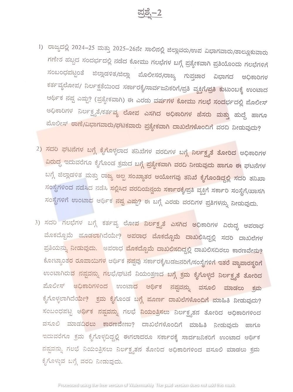 ಈ ಗಲಭೆಗಳ ಬಗ್ಗೆ ಕರ್ತವ್ಯ ಲೋಪ ನಿರ್ಲಕ್ಷ್ಯತೆ ಎಸಗಿದ ಅಧಿಕಾರಿಗಳ ವಿರುದ್ಧ ಅಪರಾಧ ಮೊಕದ್ದೊಮೆ ಹೂಡಲಾಗಿದೆಯೇ, ಅಪರಾಧ ಮೊಕೊದ್ದಮೆ ದಾಖಲಿಸದಿದ್ದಲ್ಲಿ ದಾಖಲಿಸದಿರಲು ಕಾರಣವೇನು, ಕೋಟ್ಯಾಂತರ ರೂಪಾಯಿಗಳ ಆರ್ಥಿಕ ನಷ್ಟವು ಸರ್ಕಾರಕ್ಕೆ/ಬಡಜನರಿಗೆ/ಸಂಸ್ಥೆಗಳಿಗೆ ಇತರೆ ವ್ಯಾಪಾರಸ್ಥರಿಗೆ ಉಂಟಾಗಿರುವ ನಷ್ಟವನ್ನು ಗಲಭೆ/ಘಟನೆ ನಿಯಂತ್ರಣದ ಬಗ್ಗೆ ಕ್ರಮ ಕೈಗೊಳ್ಳದೆ ನಿರ್ಲಕ್ಷ್ಯತೆ ತೋರಿದ ಪೊಲೀಸ್ ಅಧಿಕಾರಿಗಳಿಂದ ಉಂಟಾದ ಆರ್ಥಿಕ ನಷ್ಟವನ್ನು ವಸೂಲಿ ಮಾಡಲು ಕ್ರಮ ಕೈಗೊಳ್ಳಲಾಗಿದೆಯೇ ಎಂಬ ಮಾಹಿತಿಯನ್ನು ಕೋರಿರುವುದು ಗೊತ್ತಾಗಿದೆ.