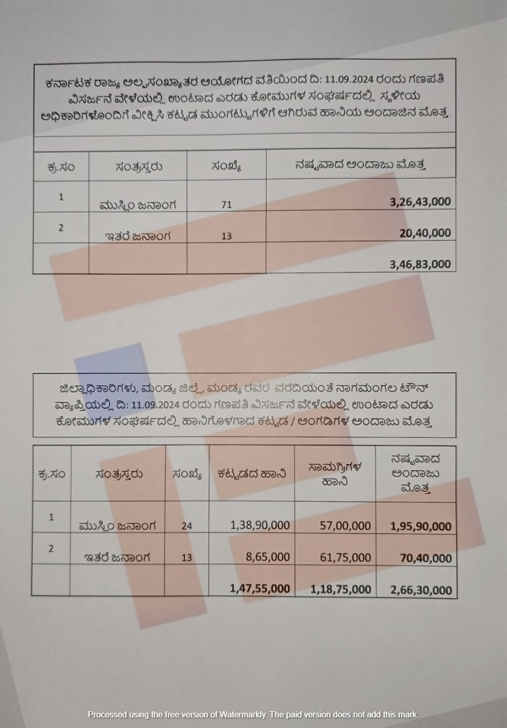 ಒಟ್ಟಾರೆ ಮುಸ್ಲಿಂ ಮತ್ತು ಇತರೆ ಜನಾಂಗದ ಕಟ್ಟಡಗಳಿಗೆ 1,47,55,000 ರು., ಸಾಮಗ್ರಿಗಳಿಗೆ 1,18,75,000 ರು ಸೇರಿ ಒಟ್ಟಾರೆ 2,66,30,000 ರು.ನಷ್ಟು ನಷ್ಟವಾಗಿದೆ ಎಂದು ವರದಿಯಿಂದ ಗೊತ್ತಾಗಿದೆ.