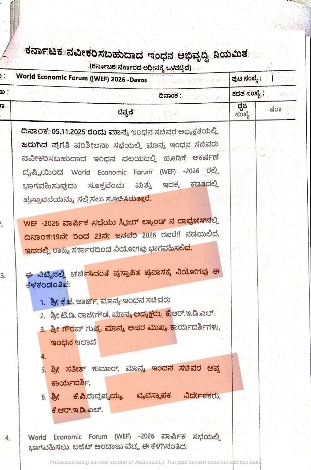 ಸ್ವಿಟ್ಜರ್ಲೆಂಡ್ನ ದಾವೋಸ್ನಲ್ಲಿ 2024ರ ಜನವರಿಯಲ್ಲಿ ನಡೆಯಲಿರುವ ವಿಶ್ವ ಆರ್ಥಿಕ ವೇದಿಕೆಯ ಸಮಾವೇಶದಲ್ಲಿ ಭಾಗವಹಿಸಿದ್ದ ಮುಖ್ಯಮಂತ್ರಿ ಸಿದ್ದರಾಮಯ್ಯ ನೇತೃತ್ವದ ನಿಯೋಗಕ್ಕೆ 12 ಕೋಟಿ ವೆಚ್ಚವಾಗಲಿದೆ ಎಂದು ಹೇಳಲಾಗಿತ್ತು.