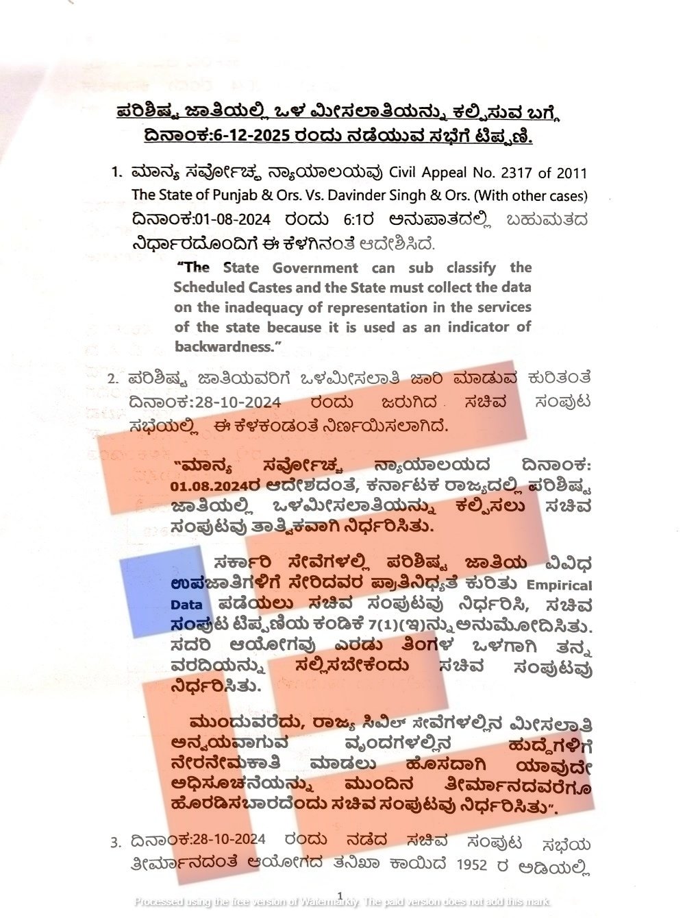 ಪರಿಶಿಷ್ಟ ಜಾತಿಯಲ್ಲಿ ಒಳ ಮೀಸಲಾತಿಯನ್ನು ಕಲ್ಪಿಸುವ ಕುರಿತು 2025ರಂದು ಇಲಾಖೆ ಮಟ್ಟದಲ್ಲಿ ನಡೆದಿದ್ದ ಸಭೆಯಲ್ಲಿ ಇಲಾಖಾಧಿಕಾರಿಗಳು ಒದಗಿಸಿರುವ ಟಿಪ್ಪಣಿಯಲ್ಲಿ ಮಾಹಿತಿ ಒದಗಿಸಿದ್ದಾರೆ. ವಿಶೇಷವಾಗಿ ಮುಂಬಡ್ತಿಯಲ್ಲಿ ಒಳ ಮೀಸಲಾತಿಯನ್ನು ಜಾರಿಗೊಳಿಸುವ ಕುರಿತು ಈ ಸಭೆಯಲ್ಲಿ ಚರ್ಚೆಯಾಗಿದೆ.