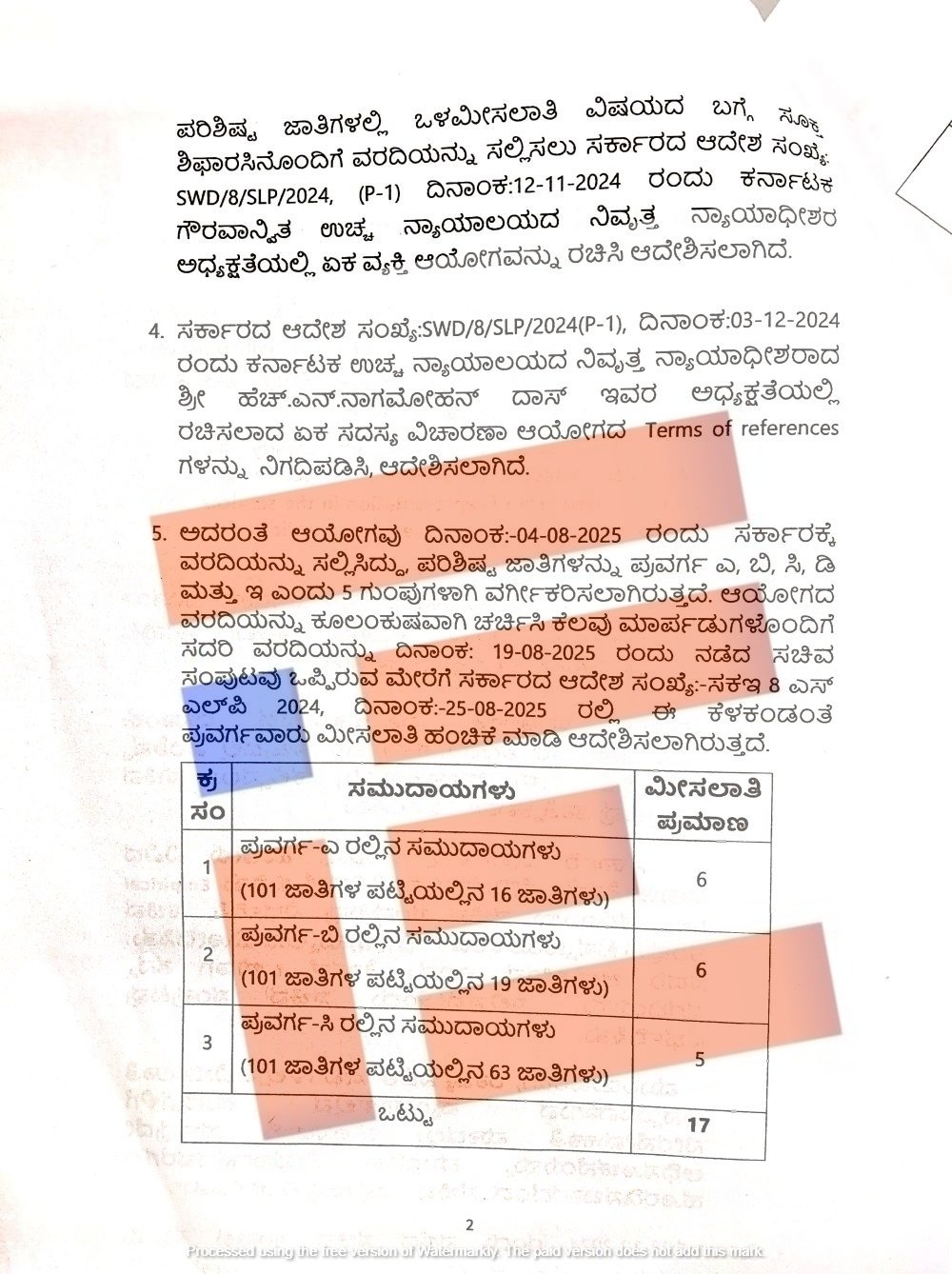 2025ರ ಆಗಸ್ಟ್ 19ರಂದು ನಡೆದಿದ್ದ ಸಚಿವ ಸಂಪುಟವು ಒಪ್ಪಿಗೆ ನೀಡಿದ್ದರ ಪ್ರಕಾರ ಪ್ರವರ್ಗ ಎ ರಲ್ಲಿನ (101 ಜಾತಿಗಳ ಪಟ್ಟಿಯಲ್ಲಿನ 16 ಜಾತಿಗಳು) ಶೇ.6ರಷ್ಟು ಮೀಸಲಾತಿ, ಪ್ರವರ್ಗ ಬಿ ರಲ್ಲಿ ಸಮುದಾಯಗಳು ( 101 ಜಾತಿಗಳ ಪಟ್ಟಿಯಲ್ಲಿನ 19 ಜಾತಿಗಳು) ಶೇ. 6, ಪ್ರವರ್ಗ ಸಿ ರಲ್ಲಿನ ಸಮುದಾಯಗಳು (101 ಜಾತಿಗಳ ಪಟ್ಟಿಯಲ್ಲಿನ 63 ಜಾತಿಗಳು) ಶೇ. 5 ಸೇರಿ ಒಟ್ಟಾರೆ ಶೇ. 17ರಷ್ಟು ಮೀಸಲಾತಿ ಹಂಚಿಕೆ ಮಾಡಿ ಆದೇಶಿಸಿತ್ತು.