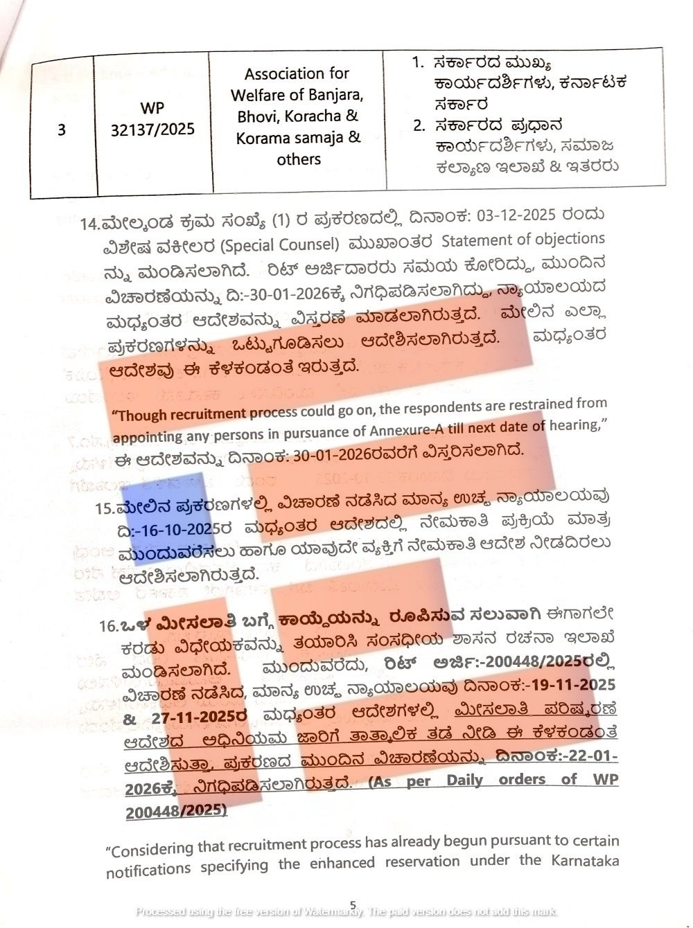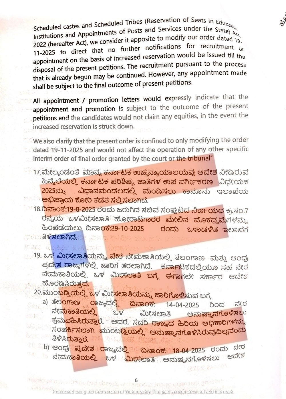ಒಳ ಮೀಸಲಾತಿ ಬಗ್ಗೆ ಕಾಯ್ದೆಯನ್ನು ರೂಪಿಸುವ ಸಲುವಾಗಿ ಈಗಾಗಲೇ ಕರಡು ವಿಧೇಯಕ ತಯಾರಿಸಿದೆ. ರಿಟ್ ಅರ್ಜಿ 200448/2025ರಲ್ಲಿ ವಿಚಾರಣೆ ನಡೆಸಿದ್ದ ಉಚ್ಛ ನ್ಯಾಯಾಲಯವು 2025ರ ನವೆಂಬರ್ 19 ಮತ್ತು 27ರಂದು ಮಧ್ಯಂತರ ಆದೇಶ ಹೊರಡಿಸಿದೆ. ಈ ಆದೇಶಗಳಲ್ಲಿ ಮೀಸಲಾತಿ ಪರಿಷ್ಕರಣೆ ಆದೇಶದ ಅಧಿನಿಯಮ ಜಾರಿಗೆ ತಾತ್ಕಾಲಿಕ ತಡೆ ನೀಡಿ ಆದೇಶ ಹೊರಡಿಸಿತ್ತು. ಪ್ರಕರಣದ ಮುಂದಿನ ವಿಚಾರಣೆಯನ್ನು 2026ರ ಜನವರಿ 22ಕ್ಕೆ ನಿಗದಿಪಡಿಸಿದೆ.