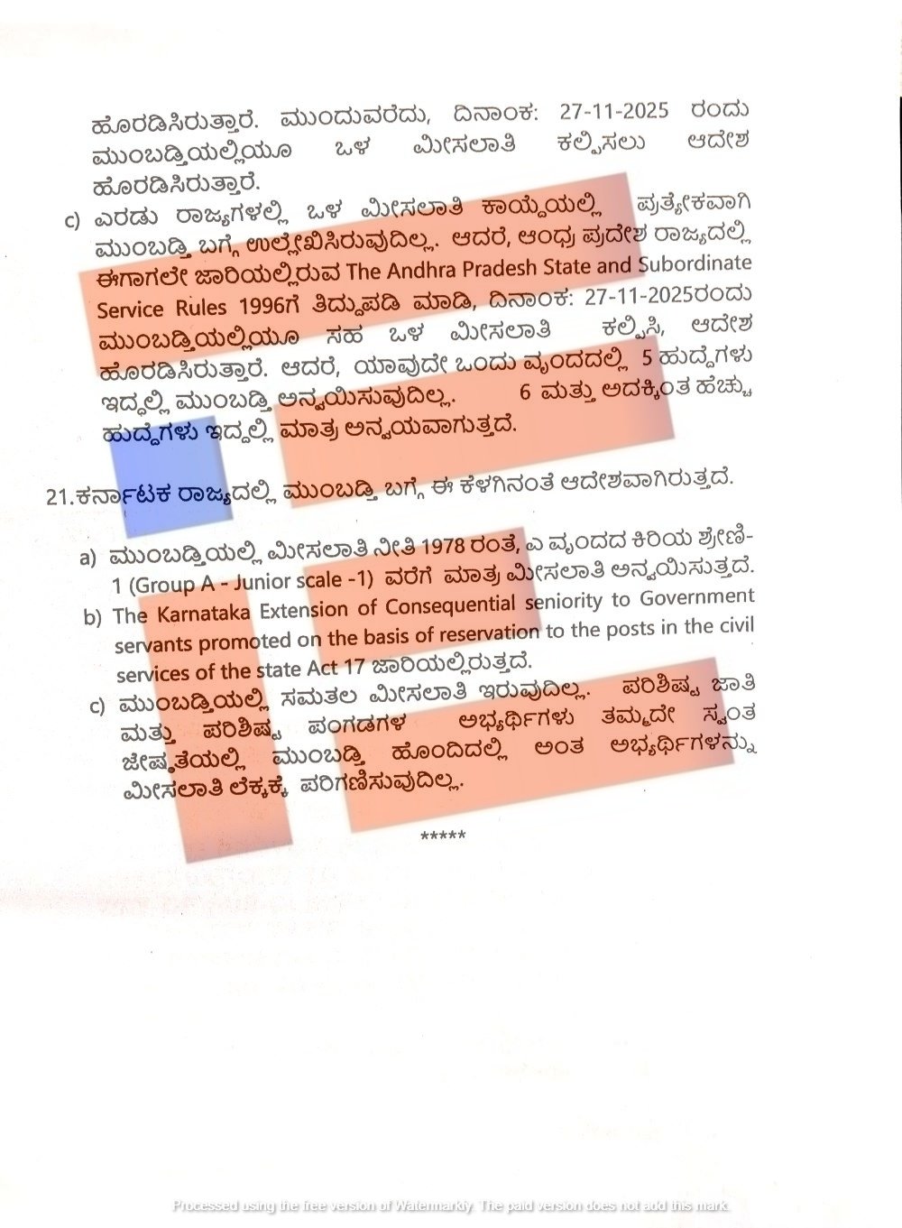 ‘ಆದರೆ ಯಾವುದೇ ಒಂದು ವೃಂದದಲ್ಲಿ 5 ಹುದ್ದೆಗಳು ಮುಂಬಡ್ತಿ ಅನ್ವಯಿಸುವುದಿಲ್ಲ. 6 ಮತ್ತು ಅದಕ್ಕಿಂತ ಹೆಚ್ಚು ಅದಕ್ಕಿಂತ ಹುದ್ದೆಗಳು ಇದ್ದಲ್ಲಿ ಮಾತ್ರ ಅನ್ವಯವಾಗುತ್ತದೆ,’ ಎಂದು ಟಿಪ್ಪಣಿಯಲ್ಲಿ ವಿವರಿಸಿರುವುದು ಗೊತ್ತಾಗಿದೆ.