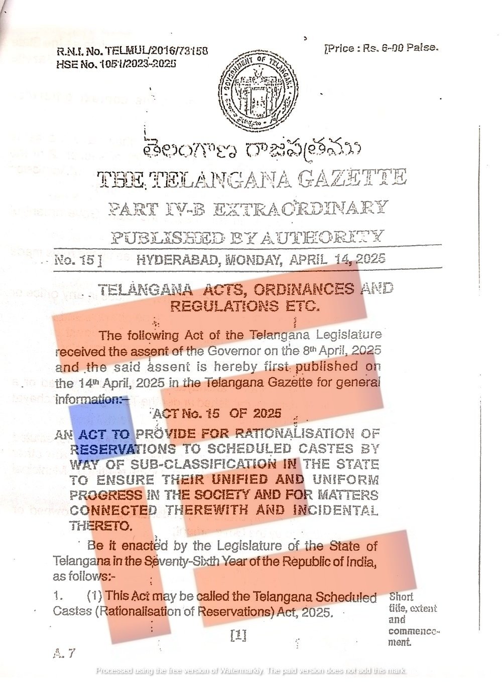 ತೆಲಂಗಾಣ ರಾಜ್ಯದಲ್ಲಿ 2025ರ ಏಪ್ರಿಲ್ 14ರಿಂದಲೇ ನೇರ ನೇಮಕಾತಿಯಲ್ಲಿ ಒಳ ಮೀಸಲಾತಿ ಅನುಷ್ಠಾನಗೊಳಿಸಲು ಕ್ರಮ ವಹಿಸಿದೆ.