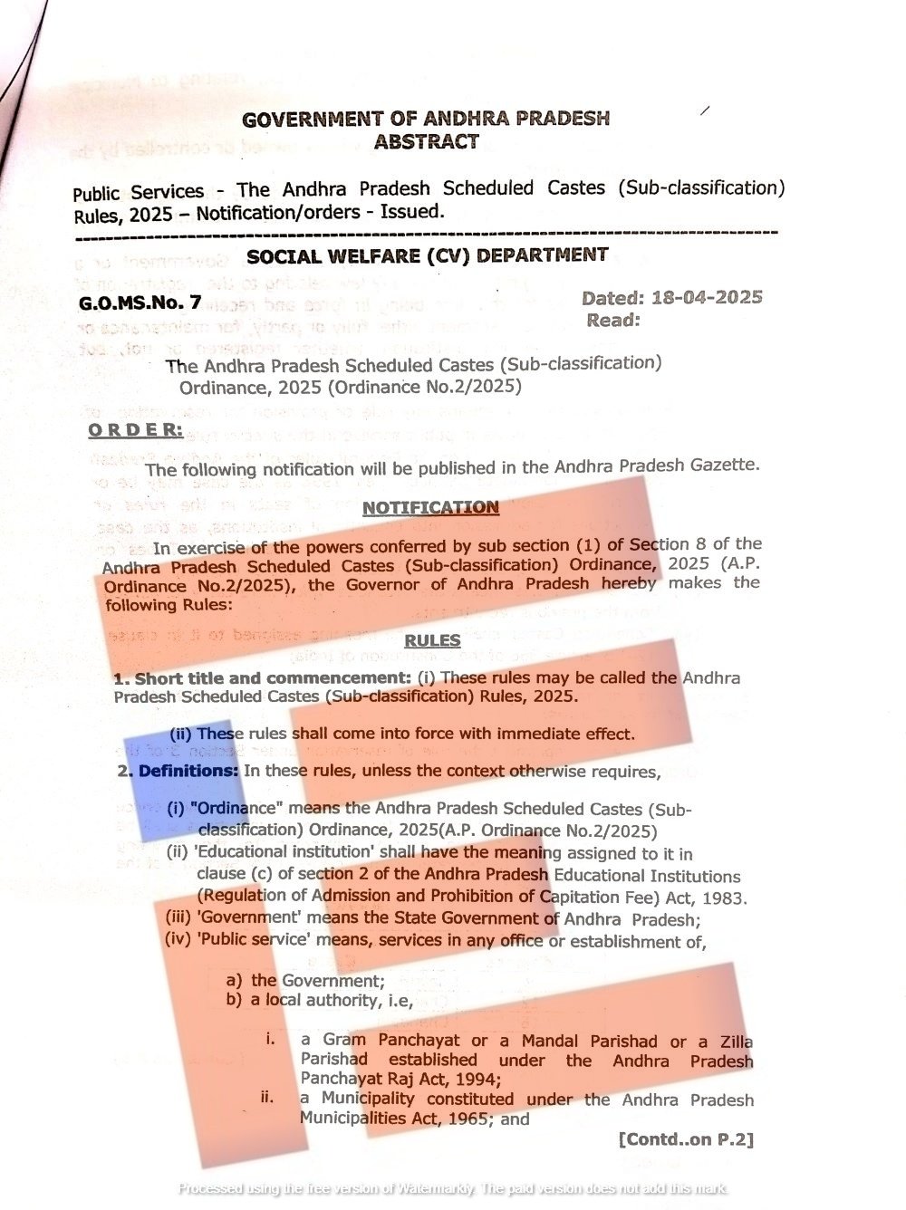 ಆಂಧ್ರ ಪ್ರದೇಶ ರಾಜ್ಯದಲ್ಲಿ 2025ರ ಏಪ್ರಿಲ್ 18ರಂದು ನೇರ ನೇಮಕಾತಿಯಲ್ಲಿ ಒಳ ಮೀಸಲಾತಿ ಅನುಷ್ಠಾನಗೊಳಿಸಲು ಆದೇಶ ಹೊರಡಿಸಿದೆ.