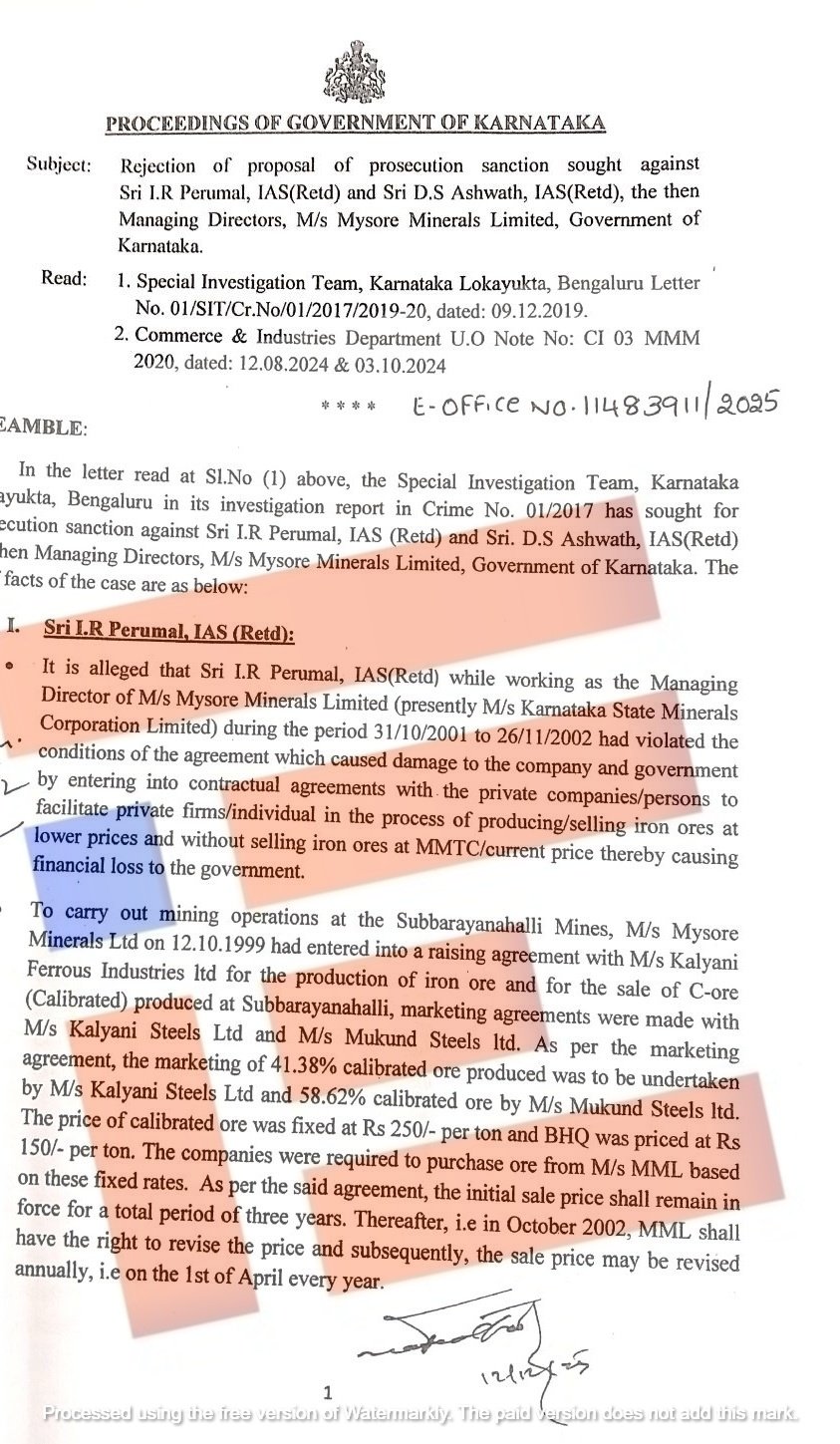 ಈ ಪ್ರಕರಣದಲ್ಲಿ ಅಧಿಕಾರ ದುರುಪಯೋಗ ಮತ್ತು ಪಿತೂರಿ ನಡೆಸಿ ಅಪರಾಧ ಎಸಗಿದ್ದಾರೆ ಎಂದು ಗುರುತಿಸಿದ್ದ ಮೈಸೂರ್ ಮಿನರಲ್ಸ್ ಲಿಮಿಟೆಡ್ನ ಹಿಂದಿನ ವ್ಯವಸ್ಥಾಪಕ ನಿರ್ದೇಶಕರಾಗಿದ್ದ ಹಿರಿಯ ಐಎಎಸ್ ಅಧಿಕಾರಿ ಐ ಆರ್ ಪೆರುಮಾಳ್ ಅವರ ವಿರುದ್ಧ ವಿಚಾರಣೆ ಪ್ರಸ್ತಾವವನ್ನೂ ಕಾಂಗ್ರೆಸ್ ಸರ್ಕಾರವು ತಿರಸ್ಕರಿಸಿದೆ.