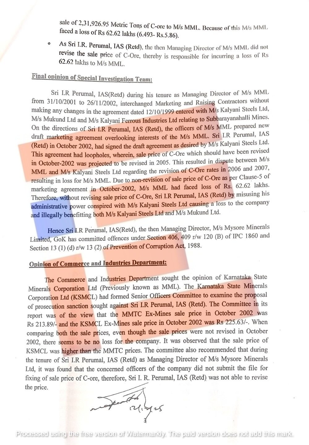 ಹಾಗೆಯೇ ಪೆರುಮಾಳ್ ಅವರು ಸೆಕ್ಷನ್ 406, 409, 120b (ಐಪಿಸಿ 1860 ರ ಬಿ0 ಸೆಕ್ಷನ್ 13(1) 13(2) ಭ್ರಷ್ಟಾಚಾರ ತಡೆ ಕಾಯ್ದೆ 1988 ರ ಅಡಿಯಲ್ಲಿ ಅಪರಾಧ ಎಸಗಿದ್ದಾರೆ ಎಂದೂ ತನ್ನ ಅಭಿಪ್ರಾಯದಲ್ಲಿ ತಿಳಿಸಿತ್ತು.