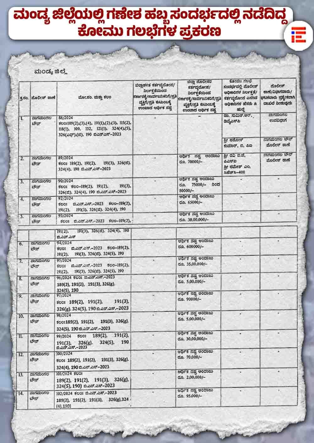 ನಾಗಮಂಗಲ ಟೌನ್ನಲ್ಲಿ 2024 ಮತ್ತು 2025ನೇ ಸಾಲಿನಲ್ಲಿ ಗಣೇಶ ಹಬ್ಬದ ಸಂದರ್ಭದಲ್ಲಿ ನಡದಿದ್ದ ಕೋಮು ಗಲಭೆ ಪ್ರಕರಣಗಳಲ್ಲಿ ಡಿವೈಎಸ್ಪಿ ಡಾ ಸುಮಿತ್ ಆರ್ ಪೊಲೀಸ್ ಇನ್ಸ್ಪೆಕ್ಟರ್ ಅಶೋಕ್ಕುಮಾರ್, ಪಿಎಸ್ಐ ರವಿ ಬಿ ಜೆ, ಹೆಡ್ ಕಾನ್ಸ್ಟೆಬಲ್ ರಮೇಶ್ ಎಂಬ ಅವರ ಕರ್ತವ್ಯ ನಿರ್ಲಕ್ಷ್ಯ, ಕರ್ತವ್ಯ ಲೋಪ ಎಸಗಿದ್ದಾರೆ ಎಂದು ಮಾಹಿತಿ ನೀಡಿದ್ದಾರೆ. ಇವರ ನಿರ್ಲಕ್ಷ್ಯ ಮತ್ತು ಲೋಪದಿಂದಾಗಿ ಒಟ್ಟಾರೆ 4,56,45,000 ರು ನಷ್ಟವಾಗಿದೆ.