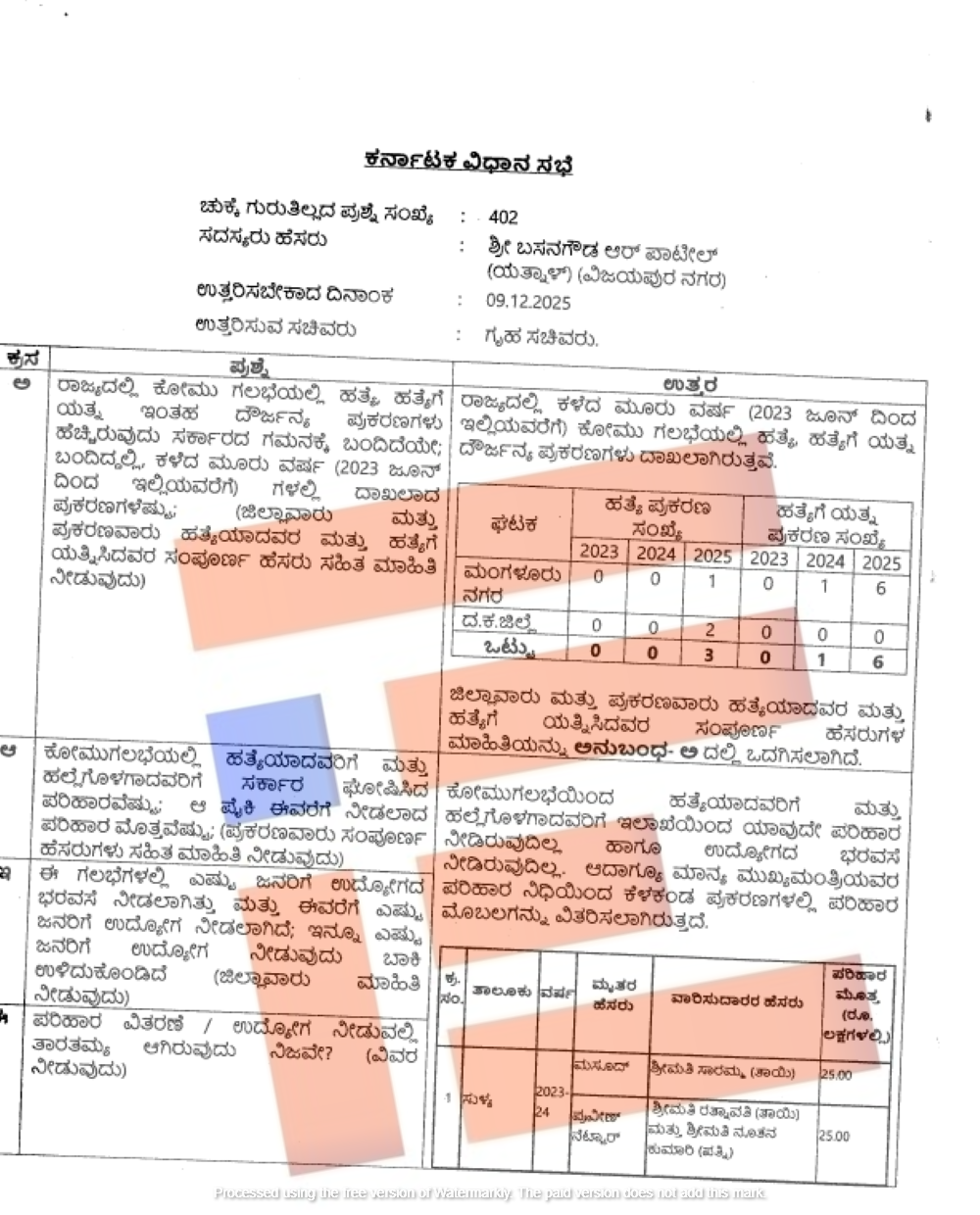 ಅದೇ ರೀತಿ ವಿಜಯಪುರ ನಗರ ಕ್ಷೇತ್ರದ ಶಾಸಕ ಬಸನಗೌಡ ಪಾಟೀಲ ಯತ್ನಾಳ ಅವರೂ ಸಹ ಕಳೆದ ಮೂರು ವರ್ಷದಲ್ಲಿ (2023ರಿಂದ 2025) ಕೋಮು ಗಲಭೆಯಲ್ಲಿ ಹತ್ಯೆ, ದೌರ್ಜನ್ಯ ಪ್ರಕರಣಗಳು ದಾಖಲಾಗಿರುವ ಬಗ್ಗೆ ಪ್ರಶ್ನೆ ಕೇಳಿದ್ದರು.