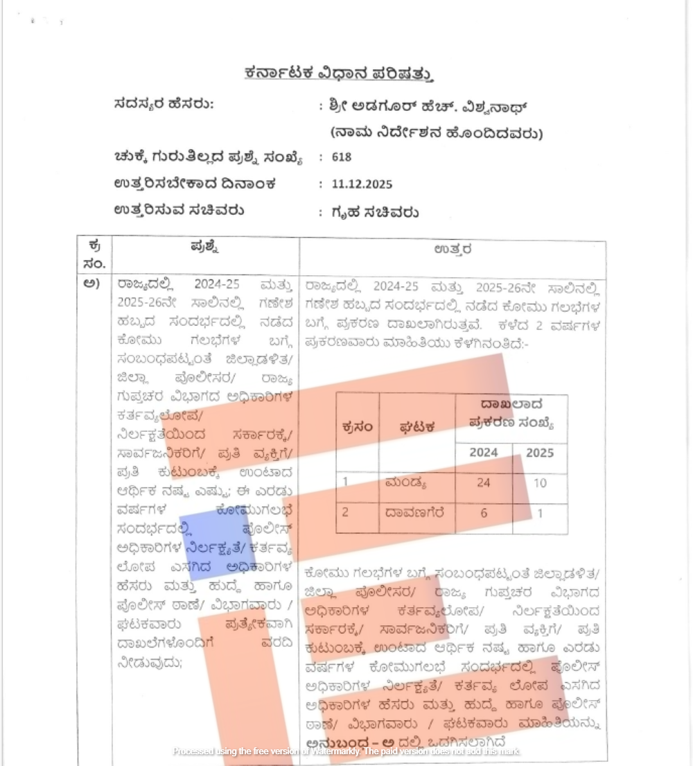 ಕೋಮು ಗಲಭೆಗಳನ್ನು ತಡೆಗಟ್ಟುವಲ್ಲಿ ನಿರ್ಲಕ್ಷ್ಯ ವಹಿಸಿದ್ದರ ಕುರಿತು ಇದರಿಂದಾಗಿರು ಆರ್ಥಿಕ ನಷ್ಟದ ಕುರಿತು ವಿಧಾನ ಪರಿಷತ್ನಲ್ಲಿ ಸದಸ್ಯ ಎಚ್ ವಿಶ್ವನಾಥ್ ಅವರು ಕೇಳಿದ್ದ ಪ್ರಶ್ನೆಗೆ ಗೃಹ ಸಚಿವ ಡಾ ಜಿ ಪರಮೇಶ್ವರ್ ಅವರು ಒದಗಿಸಿರುವ ಉತ್ತರದಲ್ಲಿ ಈ ಮಾಹಿತಿ ಇದೆ.