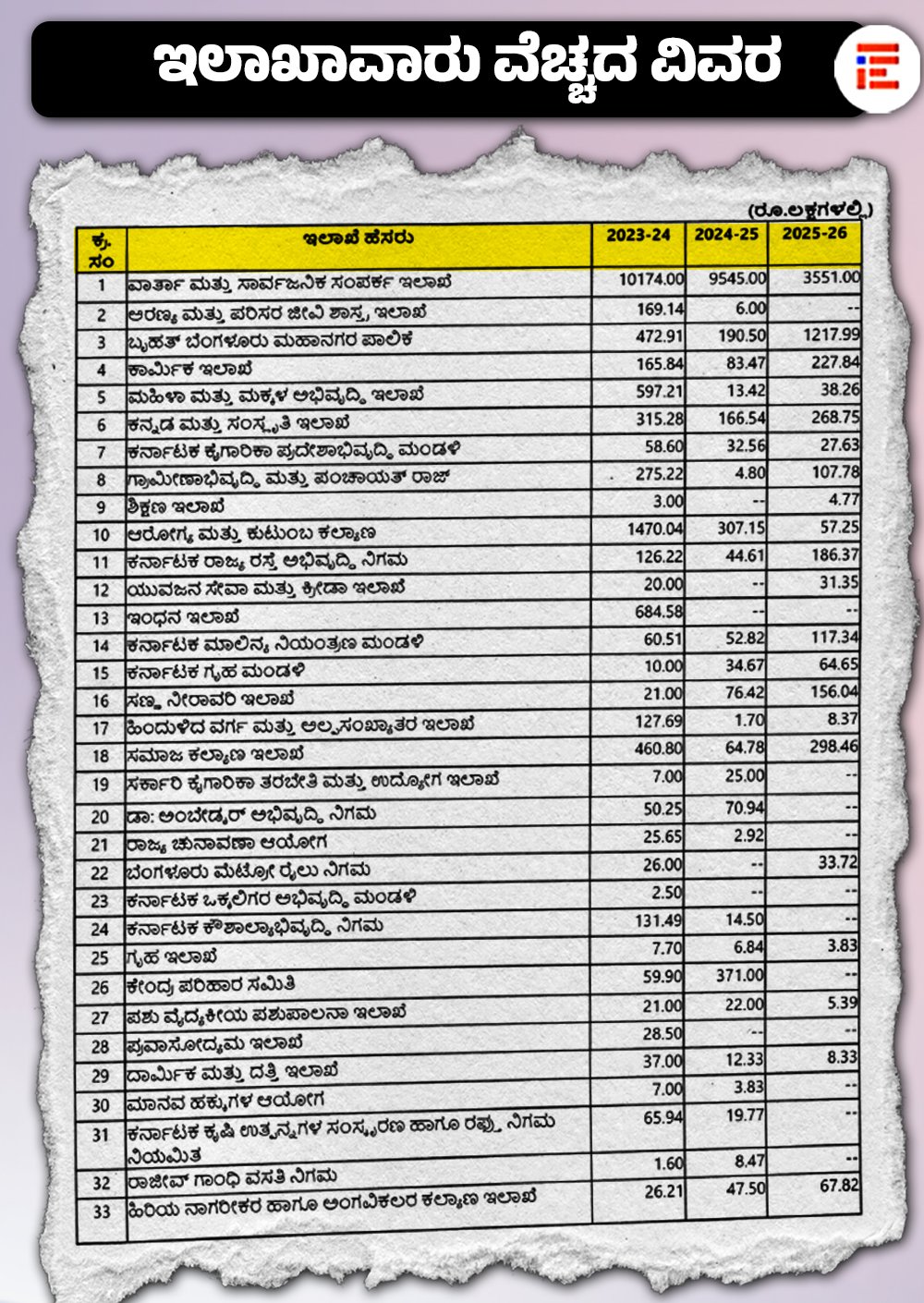 2023-24ನೇ ಸಾಲಿನಲ್ಲಿ 6.84 ಕೋಟಿ ರು. ಖರ್ಚು ಮಾಡಿದ್ದ ಇಂಧನ ಇಲಾಖೆ 2024-25ನೇ ಸಾಲಿನಲ್ಲಿ ಮತ್ತು 2025-26ನೇ ಸಾಲಿನಲ್ಲಿ ಇದುವರೆಗೆ ಒಂದು ರುಪಾಯಿಯನ್ನೂ ಜಾಹೀರಾತಿಗಾಗಿ ಖರ್ಚು ಮಾಡಿಲ್ಲ ಎಂದು ಮುಖ್ಯಮಂತ್ರಿಗಳು ಈ ಉತ್ತರದಲ್ಲಿ ತಿಳಿಸಿದ್ದಾರೆ. ಆಶ್ಚರ್ಯಕರ ವಿಷಯವೆಂದರೆ ಈ ಉತ್ತರ ಪ್ರಕಾರ, ಶಿಕ್ಷಣದ ಕುರಿತು ಜಾಗೃತಿ ಮೂಡಿಸಬೇಕಾಗಿದ್ದ ರಾಜ್ಯ ಶಿಕ್ಷಣ ಇಲಾಖೆಯು 2023-24ನೇ ಸಾಲಿನಲ್ಲಿ 3 ಲಕ್ಷ ರು.ಗಳನ್ನಷ್ಟೇ ಖರ್ಚುಮಾಡಿತ್ತು. 2024-25ನೇ ಸಾಲಿನಲ್ಲಿ ಒಂದು ರುಪಾಯಿಯನ್ನೂ ಜಾಹೀರಾತಿಗೆ ನೀಡಿಲ್ಲ. 2025-6 ಸಾಲಿನಲ್ಲಿ ಇದುವರೆಗೆ 4.77 ಲಕ್ಷ ರು.ಗಳನ್ನಷ್ಟೇ ವಿನಿಯೋಗಿಸಿದೆ.
