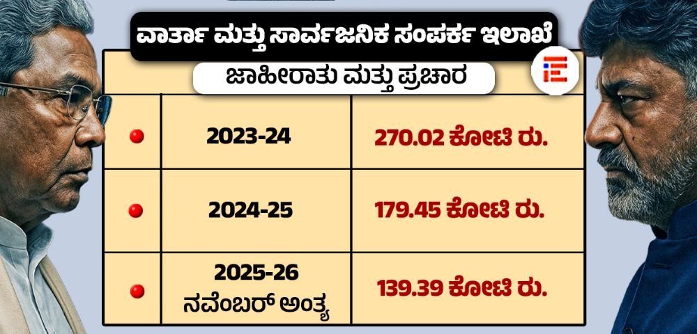 ವಾರ್ತಾ ಮತ್ತು ಸಾರ್ವಜನಿಕ ಸಂಪರ್ಕ ಇಲಾಖೆ ಮೂಲಕ ಜಾಹೀರಾತು ಮತ್ತು ಪ್ರಚಾರ ಸಂಬಂಧ 2023-24ನೇ ಆರ್ಥಿಕ ಸಾಲಿನಲ್ಲಿ 270.02 ಕೋಟಿ ರು. ಹಾಗೂ 2024-25ನೇ ಸಾಲಿನಲ್ಲಿ 179.45 ಕೋಟಿ ರು. ಮತ್ತು  2025-26ನೇ ಸಾಲಿನ ನವೆಂಬರ್‌ ಅಂತ್ಯದವರೆಗೆ 139.39 ಕೋಟಿ ರು. ಖರ್ಚು ಮಾಡಲಾಗಿದೆ.
