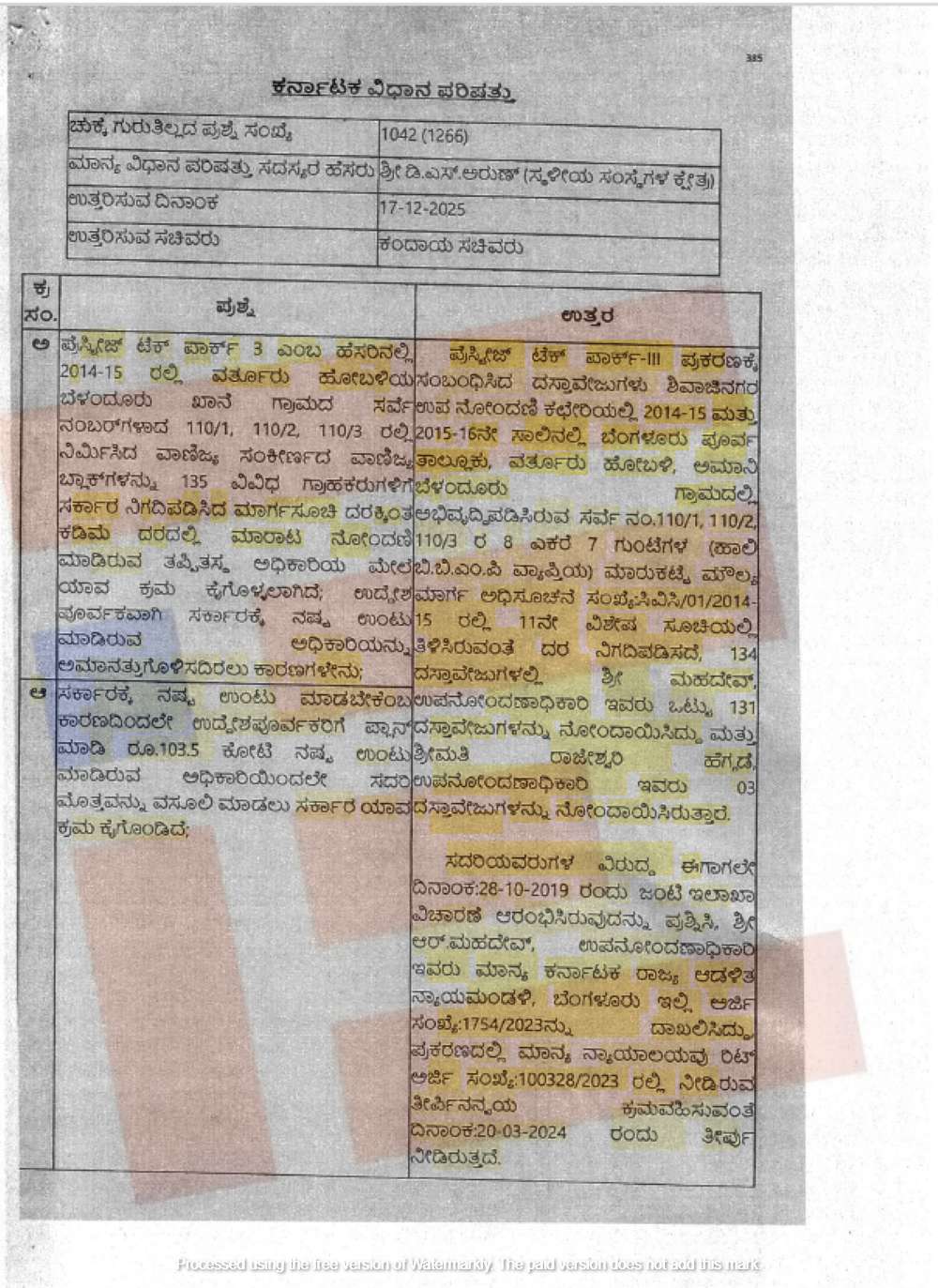 2025ರ ಡಿಸೆಂಬರ್ನಲ್ಲಿ ಬೆಳಗಾವಿಯಲ್ಲಿ ನಡೆಯುತ್ತಿರುವ ಅಧಿವೇಶನದಲ್ಲಿಯೂ ಸದಸ್ಯ ಡಿ ಎಸ್ ಅರುಣ್ ಅವರು ಇದೇ ಪ್ರಕರಣದ ಕುರಿತು ಪ್ರಶ್ನೆ ಕೇಳಿದ್ದಾರೆ. ಈ ಪ್ರಶ್ನೆಗೆ 2025ರ ಡಿಸೆಂಬರ್ 17ರಂದು ಈಗಿನ ಕಂದಾಯ ಸಚಿವ ಕೃಷ್ಣ ಬೈರೇಗೌಡ ಅವರು ಉತ್ತರ ನೀಡಿದ್ದಾರೆ.