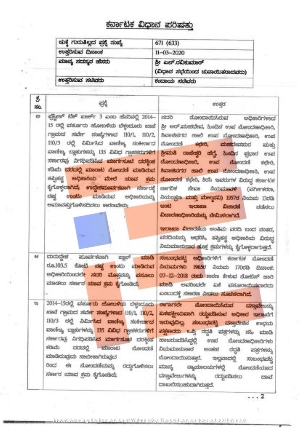 ಸರ್ಕಾರಕ್ಕೆ ನಷ್ಟ ಉಂಟು ಮಾಡಬೇಕೆಂಬ ಕಾರಣದಿಂದಲೇ ಉದ್ದೇಶಪೂರ್ವಕವಾಗಿ ಪ್ಲಾನ್ ಮಾಡಿ 103.5 ಕೋಟಿ ನಷ್ಟ ಉಂಟುಮಾಡಿರುವ ಅಧಿಕಾರಿಯಿಂದಲೇ ಸದರಿ ಮೊತ್ತವನ್ನು ವಸಸೂಲಿ ಮಾಡಲು ಸರ್ಕಾರ ಯಾವ ಕ್ರಮ ಕೈಗೊಂಡಿದೆ ಎಂದು ಕೇಳಿದ್ದಾರೆ.