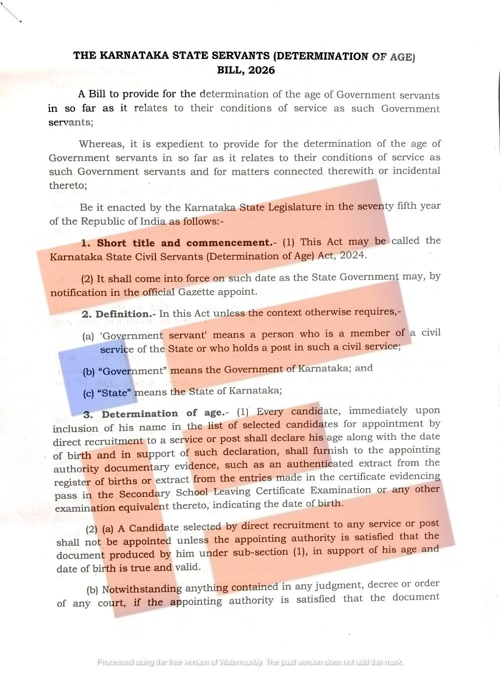 ಕರ್ನಾಟಕ ರಾಜ್ಯ ನೌಕರರ ವಯಸ್ಸನ್ನು ಖಚಿತಪಡಿಸಿಕೊಳ್ಳುವ ವಿಧೇಯಕ 2026ರ ಕರಡು ಪ್ರತಿಯು ‘ದಿ ಫೈಲ್‌’ಗೆ ಲಭ್ಯವಾಗಿದೆ.
