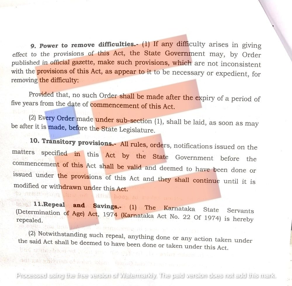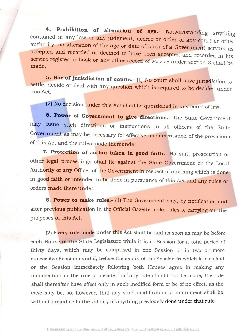 ಯಾವುದೇ ಕಾನೂನು ಅಥವಾ ಯಾವುದೇ ನ್ಯಾಯಾಲಯ ಅಥವಾ ಇತರ ಪ್ರಾಧಿಕಾರದ ಯಾವುದೇ ತೀರ್ಪು, ತೀರ್ಪು ಅಥವಾ ಆದೇಶದಲ್ಲಿ ಏನೇ ಇದ್ದರೂ ಸಹ ಸರ್ಕಾರಿ ನೌಕರನ ವಯಸ್ಸು ಅಥವಾ ಜನ್ಮ ದಿನಾಂಕವನ್ನು ಅಂಗೀಕರಿಸಲಾಗಿದೆ ಮತ್ತು ದಾಖಲಿಸಲಾಗಿದೆ ಅಥವಾ ಅವನ ಸೇವಾ ನೋಂದಣಿ ಅಥವಾ ಪುಸ್ತಕದಲ್ಲಿ ಅಥವಾ ಸೆಕ್ಷನ್ 3 ರ ಅಡಿಯಲ್ಲಿ ಯಾವುದೇ ಇತರ ಸೇವೆಯ ನೋಂದಣಿಯಲ್ಲಿ ಅಂಗೀಕರಿಸಲಾಗಿದೆ ಮತ್ತು ದಾಖಲಿಸಲಾಗಿದೆ ಎಂದು ಪರಿಗಣಿಸಲಾಗಿದೆ ಎಂದು ಬದಲಾಯಿಸಬಾರದು ಎಂದು ವಿಧೇಯದಲ್ಲಿ ಸ್ಪಷ್ಟಪಡಿಸಿರುವುದು ತಿಳಿದು ಬಂದಿದೆ.