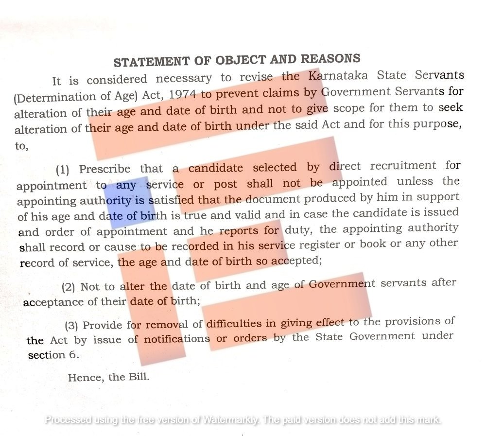 ‘ಸರ್ಕಾರಿ ನೌಕರರು ತಮ್ಮ ವಯಸ್ಸು ಮತ್ತು ಜನ್ಮ ದಿನಾಂಕವನ್ನು ಬದಲಾಯಿಸುವ ಕೋರಿಕೆಗಳನ್ನು ತಡೆಯಲು ಮತ್ತು ಈ ಕಾಯ್ದೆಯಡಿಯಲ್ಲಿ ತಮ್ಮ ವಯಸ್ಸು ಮತ್ತು ಜನ್ಮ ದಿನಾಂಕವನ್ನು ಬದಲಾಯಿಸಲು ಅವರಿಗೆ ಅವಕಾಶ ನೀಡದಿರಲು ಕರ್ನಾಟಕ ರಾಜ್ಯ ನೌಕರರ (ವಯಸ್ಸು ನಿರ್ಣಯ) ಕಾಯ್ದೆ, 1974 ಅನ್ನು ಪರಿಷ್ಕರಿಸುವುದು ಅಗತ್ಯವೆಂದು ಪರಿಗಣಿಸಲಾಗಿದೆ,’ ಎಂದು ಸಮರ್ಥಿಸಿಕೊಂಡಿರುವುದು ಕರಡು ವಿಧೇಯಕದಿಂದ ಗೊತ್ತಾಗಿದೆ.