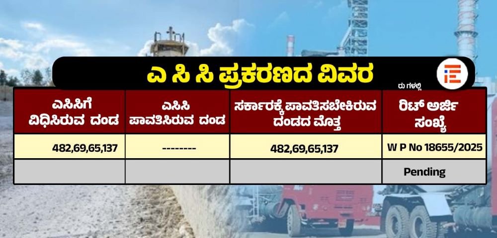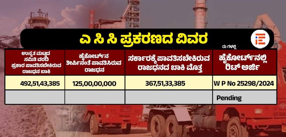 ಗಣಿಗಾರಿಕೆ ಚಟುವಟಿಕೆಗಳಲ್ಲಿ ವಿವಿಧ ರೀತಿಯ ಉಲ್ಲಂಘನೆ ನಡೆಸಿರುವ ಗುರುತರವಾದ ಆರೋಪಕ್ಕೆ ಗುರಿಯಾಗಿರುವ ಎಸಿಸಿ ಲಿಮಿಟೆಡ್ ವಿರುದ್ಧ ಸರ್ಕಾರವು 482.69 ಕೋಟಿಯಷ್ಟು ದಂಡ ವಿಧಿಸಿತ್ತು. ಈ ಕುರಿತು ಎಸಿಸಿ ಲಿಮಿಟೆಡ್, ಕರ್ನಾಟಕ ಹೈಕೋರ್ಟ್ನಲ್ಲಿ ರಿಟ್ ಅರ್ಜಿ (ಸಂಖ್ಯೆ; ಡಬ್ಲ್ಯೂ ಪಿ 18655/2025) ಸಲ್ಲಿಸಿತ್ತು.
