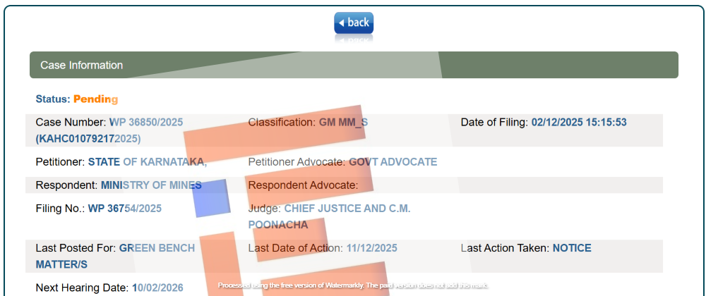 ಕೇಂದ್ರ ಸರ್ಕಾರದ ಗಣಿ ಮಂತ್ರಾಲಯ ಮತ್ತು ಪರಿಷ್ಕರಣೆ ಪ್ರಾಧಿಕಾರ ನೀಡಿದ್ದ ತೀರ್ಪನ್ನು ರಾಜ್ಯ ಸರ್ಕಾರವೂ ಸಹ ಉಚ್ಛ ನ್ಯಾಯಾಲಯದಲ್ಲಿ 2025ರ ಡಿಸೆಂಬರ್ 2ರಂದು ರಿಟ್ ಅರ್ಜಿ (ಸಂಖ್ಯೆ ಡಬ್ಲ್ಯೂ ಪಿ 36850/2025) ಸಲ್ಲಿಸಿತ್ತು. ಈ ಪ್ರಕರಣವೂ ಸಹ ಇನ್ನೂ ವಿಚಾರಣೆ ಹಂತದಲ್ಲಿ ಬಾಕಿ ಇದೆ.