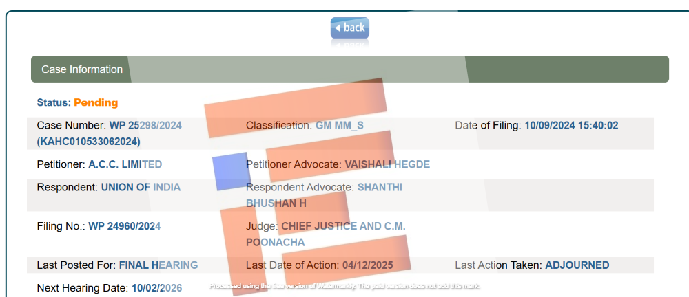 ಈ ಸಂಬಂಧವೂ ಎಸಿಸಿ ಲಿಮಿಟೆಡ್, ಉಚ್ಛ ನ್ಯಾಯಾಲಯದಲ್ಲಿ ರಿಟ್ ಅರ್ಜಿ (ಡಬ್ಲ್ಯೂ ಪಿ 25298/2024) ಸಲ್ಲಿಸಿದೆ. ಈ ಪ್ರಕರಣವು ಇನ್ನೂ ವಿಚಾರಣೆ ಹಂತದಲ್ಲಿದೆ ಎಂದು ಉನ್ನತ ಮಟ್ಟದ ಸಮಿತಿಯು ವರದಿಯಲ್ಲಿ ವಿವರಿಸಿರುವುದು ಗೊತ್ತಾಗಿದೆ.