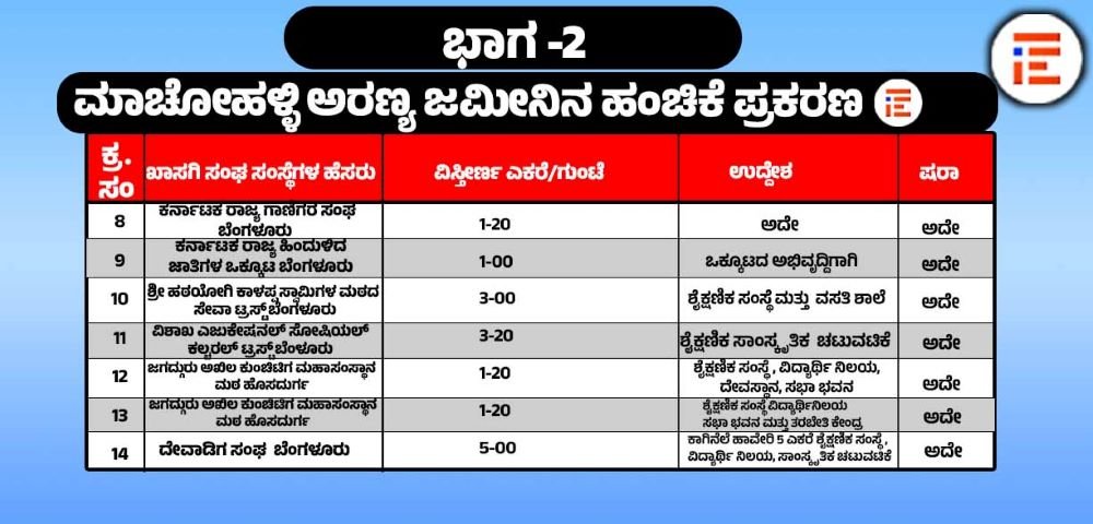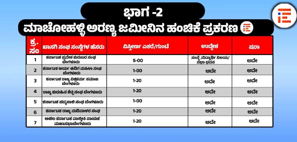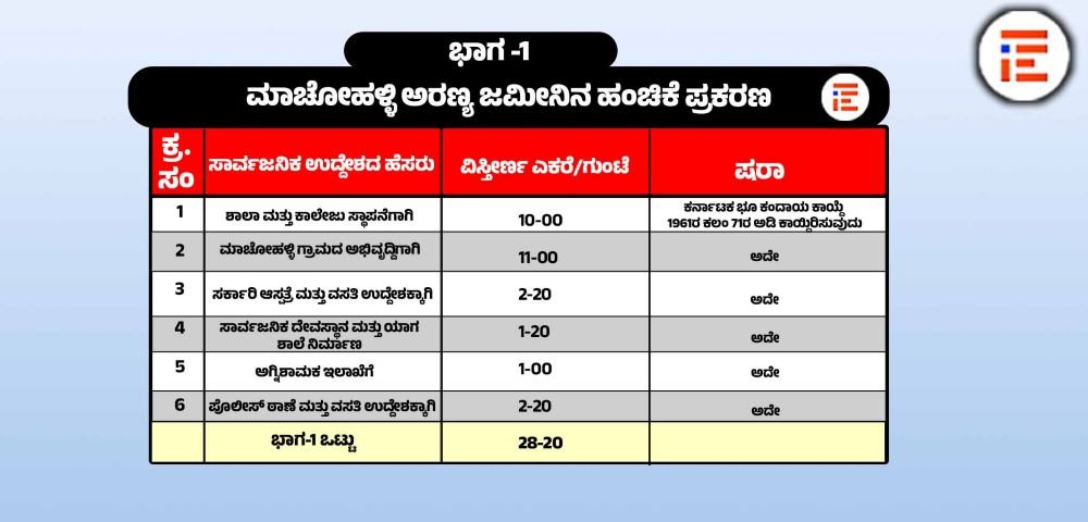 ಮಾಚೋಹಳ್ಳಿ ಅರಣ್ಯ ಜಮೀನನ್ನು ಸಂಘ ಸಂಸ್ಥೆಗಳಿಗೆ ಮಂಜೂರು ಮಾಡಿರುವ ಪ್ರಕರಣವು ಉಚ್ಛ ನ್ಯಾಯಾಲಯದಲ್ಲಿ ವಿಚಾರಣೆ ಹಂತದಲ್ಲಿದೆ. ಈ ಪ್ರಕರಣದ ವಿಚಾರಣೆಯು 2026ರ ಏಪ್ರಿಲ್ 1ಕ್ಕೆ ನಿಗದಿಯಾಗಿದೆ. ಈ ಬೆಳವಣಿಗೆಯ ನಡುವೆಯೇ ಈ ಪ್ರಕರಣದಲ್ಲಿ ಮೂರು ಇಲಾಖೆಗಳ ಅಸಮ್ಮತಿ ವ್ಯಕ್ತಪಡಿಸಿದ್ದವು ಎಂಬ ಸಂಗತಿಯು ಮುನ್ನೆಲೆಗೆ ಬಂದಿದೆ.