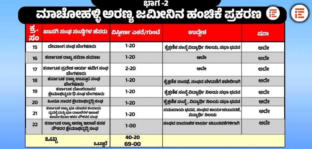 ಹಾಗೆಯೇ 22 ಖಾಸಗಿ ಸಂಘ ಸಂಸ್ಥೆಗಳು ಗುತ್ತಿಗೆ ಆಧಾರದ ಮೇಲೆ ಕೋರಿರುವ 20-40 ಎಕರೆ ಜಮೀನನ್ನು ಬಹುತೇಕ ಒಂದೇ ತೆರನಾದ ಉದ್ದೇಶಕ್ಕೆ ಅಂದರೇ ಶೈಕ್ಷಣಿಕ, ವಿದ್ಯಾರ್ಥಿ ನಿಲಯ, ಸಭಾ ಭವನ ಹಾಗೂ ಒಂದೆರಡು ಪ್ರಕರಣಗಳಲ್ಲಿ ಮಾತ್ರ ದೇವಸ್ಥಾನ, ಸಾಂಸ್ಕೃತಿಕ ಚಟುವಟಿಕೆಗಳಿಗೆ ಕೋರಿದ್ದವು.