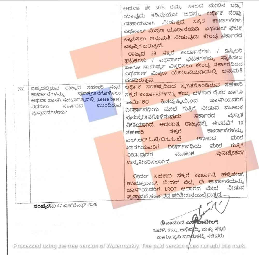 ಆರ್ಥಿಕ ಸಂಕಷ್ಟದಿಂದ ಸ್ಥಗಿತಗೊಂಡಿರುವ ಸಹಕಾರಿ ಸಕ್ಕರೆ ಕಾರ್ಖಾನೆಗಳನ್ನು ಕಬ್ಬು ಬೆಳೆಗಾರ ರೈತರ ಹಾಗೂ ಕಾರ್ಮಿಕರ ಹಿತದೃಷ್ಟಿಯಿಂದ ಖಾಸಗಿಯವರಿಗೆ ದೀರ್ಘಾವಧಿ ಗುತ್ತಿಗೆ ನೀಡಲಾಗುತ್ತಿದೆ. ರಾಜ್ಯದಲ್ಲಿ ಇದುವರೆಗೆ 10 ಸಹಕಾರಿ ಸಕ್ಕರೆ ಸಕ್ಕರೆ ಕಾರ್ಖಾನೆಗಳನ್ನು ಎಲ್ಆರ್ಒಟಿ, ಬಿಓಒಟಿ ಆಧಾರದ ಮೇಲೆ ಖಾಸಗಿಯವರಿಗೆ ದೀರ್ಘಾವಧಿ ಗುತ್ತಿಗೆ ನೀಡಿ ಪುನಶ್ಚೇತನಗೊಳಿಸಲಾಗಿದೆ ಎಂದು ಉತ್ತರಿಸಿದ್ದಾರೆ.