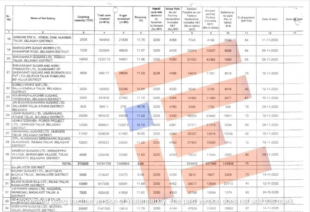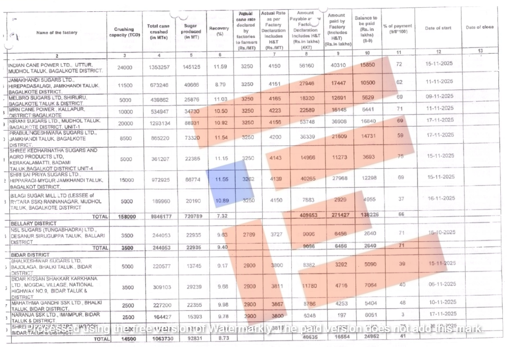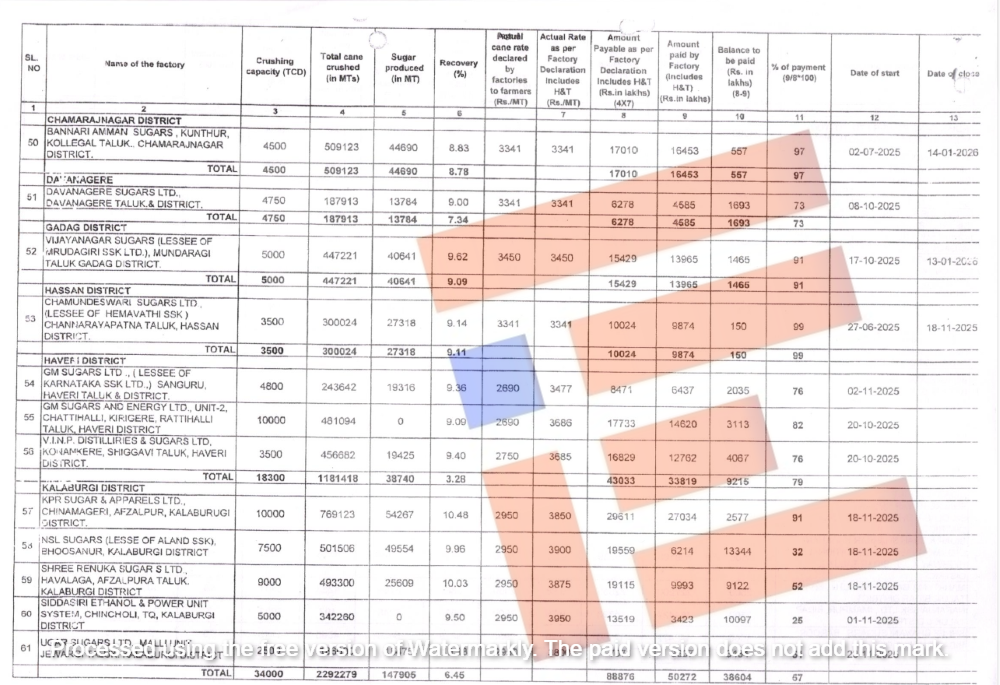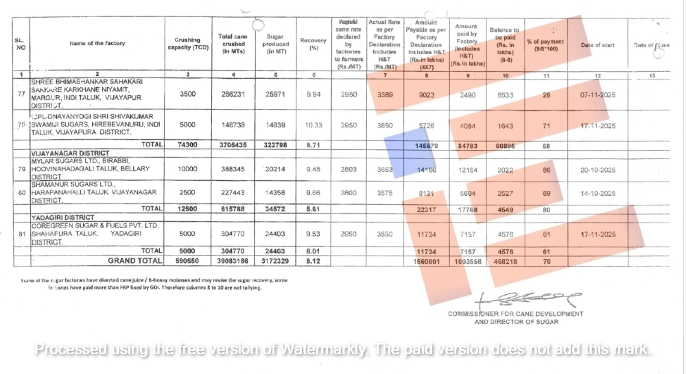 2025-26ನೇ ಹಂಗಾಮಿನಲ್ಲಿ 81 ಸಕ್ಕರೆ ಕಾರ್ಖಾನೆಗಳು ಕಾರ್ಯನಿರತವಾಗಿದೆ. 2026ರ ಜನವರಿ 15ಕ್ಕೆ ಕಬ್ಬು ಸರಬರಾಜು ಮಾಡಿದ ರೈತರಿಗೆ ಸಕ್ಕರೆ ಕಾರ್ಖಾನೆಗಳು ಪಾವತಿಸಬೇಕಾದ ಕಬ್ಬು ಬಿಲ್ ಮೊತ್ತ 16,609.01 ಕೋಟಿಗಳಾಗಿವೆ. ಈ ಪೈಕಿ 10,935.58 ಕೋಟಿ ರು.ಗಳು ಪಾವತಿಯಾಗಿದೆ. ಇನ್ನೂ 4,682.8 ಕೋಟಿ ಪಾವತಿಸಲು ಬಾಕಿ ಇದೆ ಎಂದು ಸಚಿವ ಶಿವಾನಂದ ಪಾಟೀಲ್ ಅವರು ಉತ್ತರಿಸಿದ್ದಾರೆ.